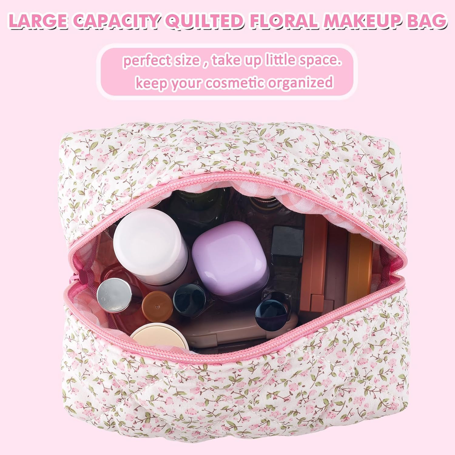 This quilted makeup bag is absolutely adorable! The floral design is so cute and feminine, perfect for keeping my cosmetics organized. The puffy cotton material feels soft yet durable, and the size is just right—fits all my essentials without being bulky. Love how versatile it is—great for travel, daily use, or even as a cute little gift. The quality feels amazing for the price, and the pink color is just as pretty in person. A must-have for anyone who loves stylish and practical beauty storage!