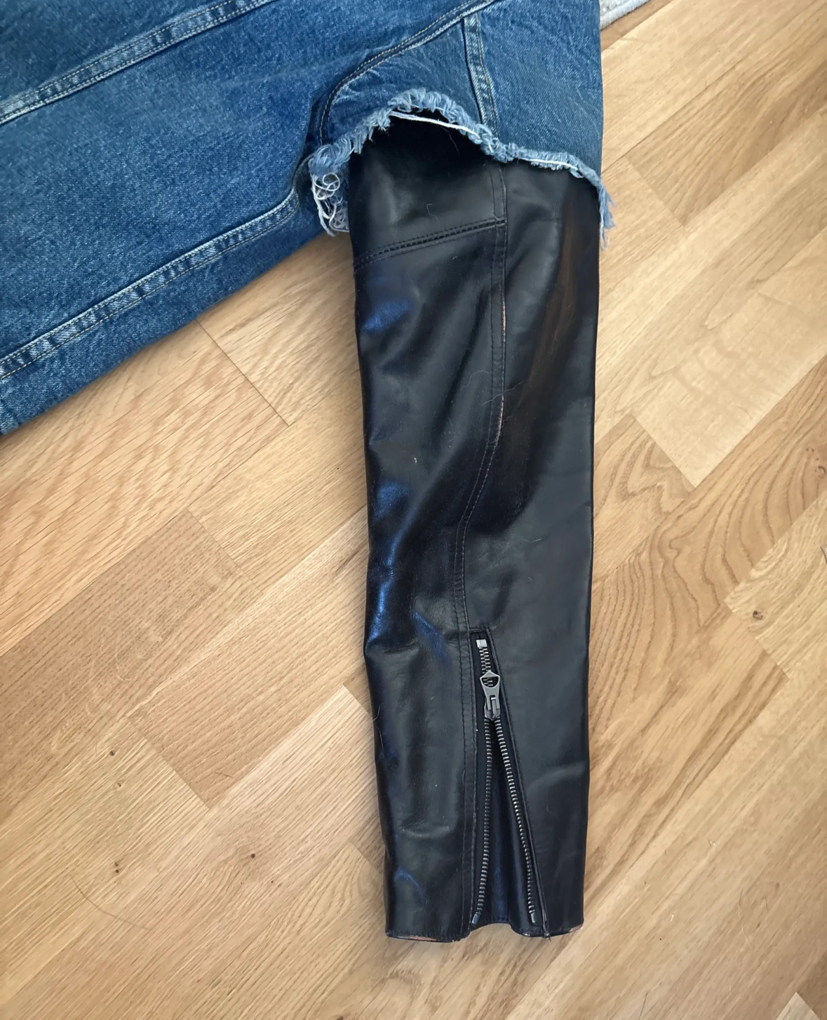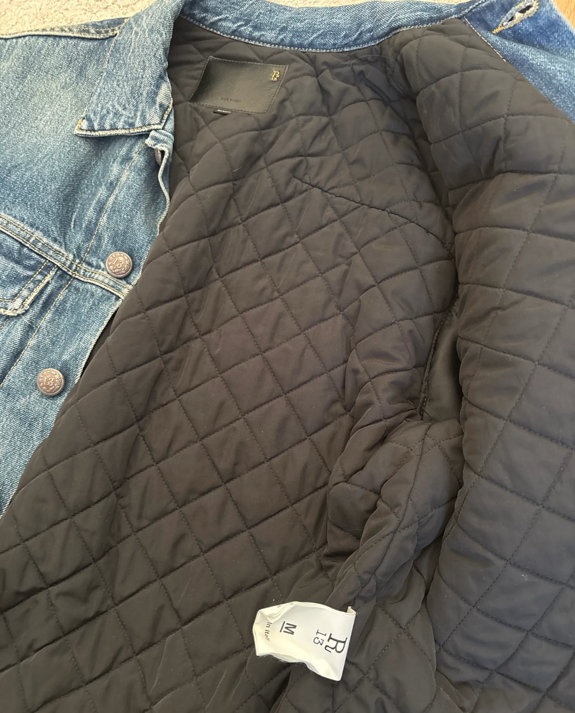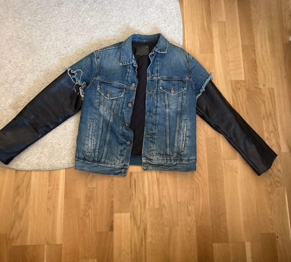 The R13 Kelly Trucker Jeans Jacket with Leather Sleeves is a stylish and versatile outerwear option for women. Made from durable cotton with leather sleeves, this basic jacket in a multicolor finish is perfect for everyday wear. The regular fit and medium size make it a flattering and comfortable option for any wardrobe. With the iconic R13 brand name, this jacket is sure to add a touch of sophistication to any outfit. #r13 #denimjacket #jeansjakke #leathersleeves #truckerjacket #grungestyle #streetwear #highfashion #designerjacket #secondhandstyle #bruktklær #gjenbruk #osloseller #vintagevibe #uniquejacket #r13brand #pimpetopp #punkstyle #sustainablefashion #mediumsize