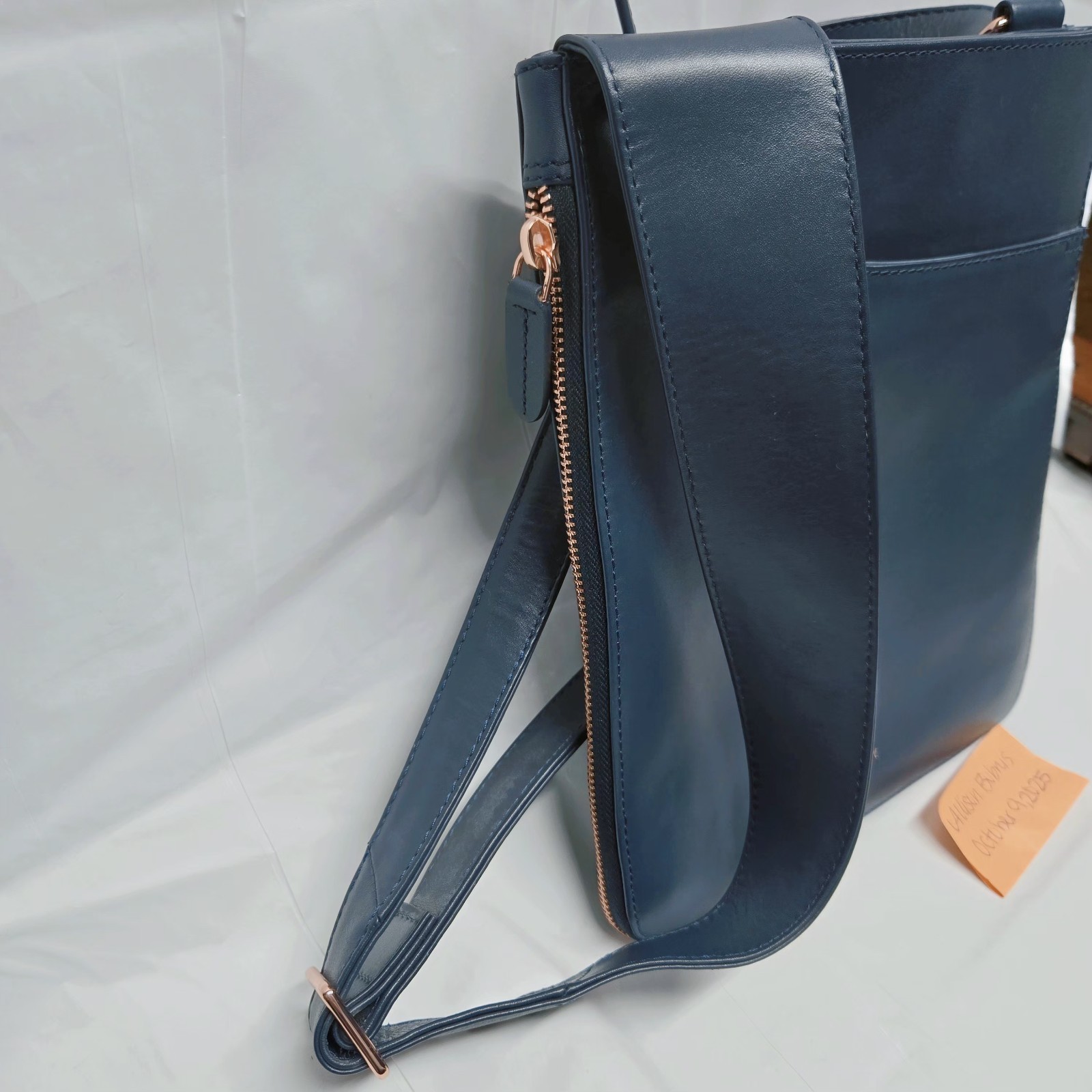 Radley London Pockets Medium Zip-Around Crossbody Bag This versatile and stylish Radley London Pockets crossbody bag is a must-have for everyday use. Crafted from beautiful navy-colored leather, this functional handbag features a slim, rectangular design and a secure zip-top closure. It is perfect for those who appreciate both style and practicality. Exterior Details: ▪︎Material: High-quality, durable navy-colored leather with a smooth finish. ▪︎Pockets: Features a signature curved front slip pocket and a rear zip pocket for quick access to essentials. ▪︎Hardware: Gold-tone hardware, including the zip closure and strap attachments. ▪︎Accents: The classic foil-stamped Radley London logo. ▪︎Strap: An adjustable strap allows the bag to be worn as a shoulder bag or crossbody. Interior Details: ▪︎Lining: Lined with a fabric material, such as polyester, in a solid color or a patterned design. ▪︎Pockets: The main compartment includes one interior zip pocket for securing valuables and two slip pockets, perfect for a phone or keys. Dimensions: ▪︎Width: Approximately 8.7 inches ▪︎Height: Approximately 10.6 inches ▪︎Depth: Approximately 1.4 inches ▪︎Adjustable strap drop: Approximately 15 inches to 25.5 inches Condition: The pictures show an accurate representation of this handbag. The bag is in excellent shape, with no visible marks, tears, stains, scuffs, or any signs of wear. The bag looks and feels like new. It's been stored away from all animals and elements. This handbag comes from a smoke, pet, and fragrance free home.