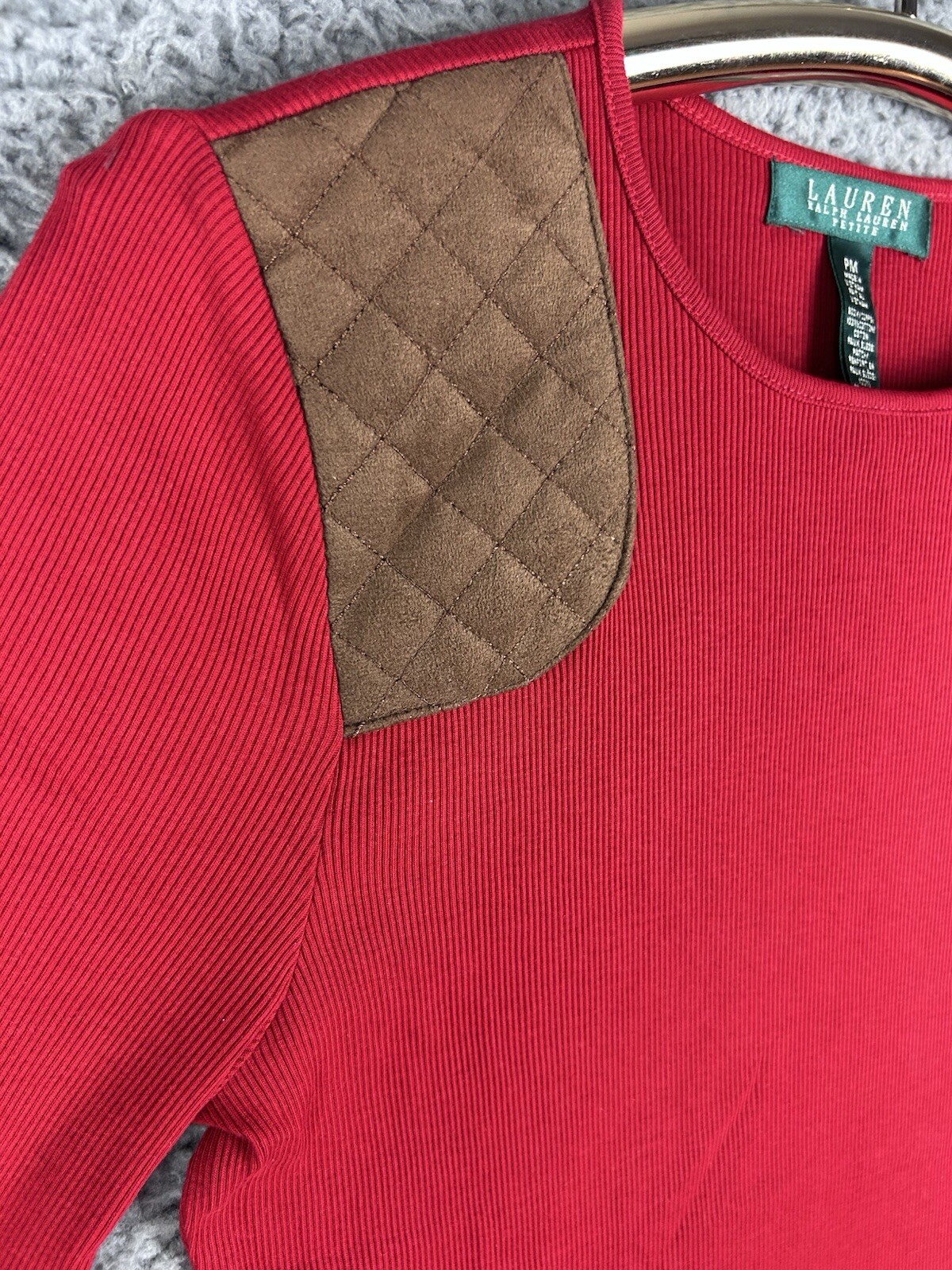 Add a touch of elegance to your casual wardrobe with this beautiful red blouse from Lauren Ralph Lauren. The blouse features a round neckline, 3/4 sleeves, and a pullover closure. The faux suede shoulder top with ribbed patch adds a touch of sophistication to the overall design. Made from high-quality cotton knit fabric, this blouse is machine washable and easy to care for. The solid pattern and regular fit make it a versatile piece that can be worn during any season. Whether you're going out for a lunch date or running errands, this blouse is the perfect choice for any casual occasion.