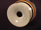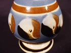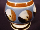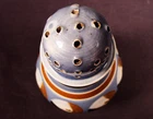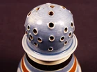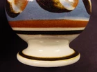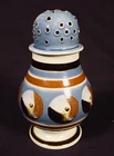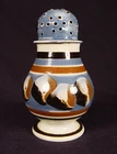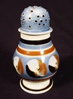 Here we have a wonderful baluster form pepper pot decorated with 8 cat’s eyes around the side. Each cat’s eye is decorated with white, black and brown glaze on a blue glaze background. This pepper pot was molded in 2 pieces, the body and top which were joined whe n the clay was still wet prior to firing. Measuring 4 ¼” in height to the top of the pepper pot, this survives in original mint condition with no damage or repairs, having been cherished and cared for 200+ years by collectors who value the importance of this great piece of mocha pottery. The match to this wonderful pepper pot is shown on page 70 in Jonathan Rickard’s definitive book “MOCHA and related dipped wares, 1770-1939”.