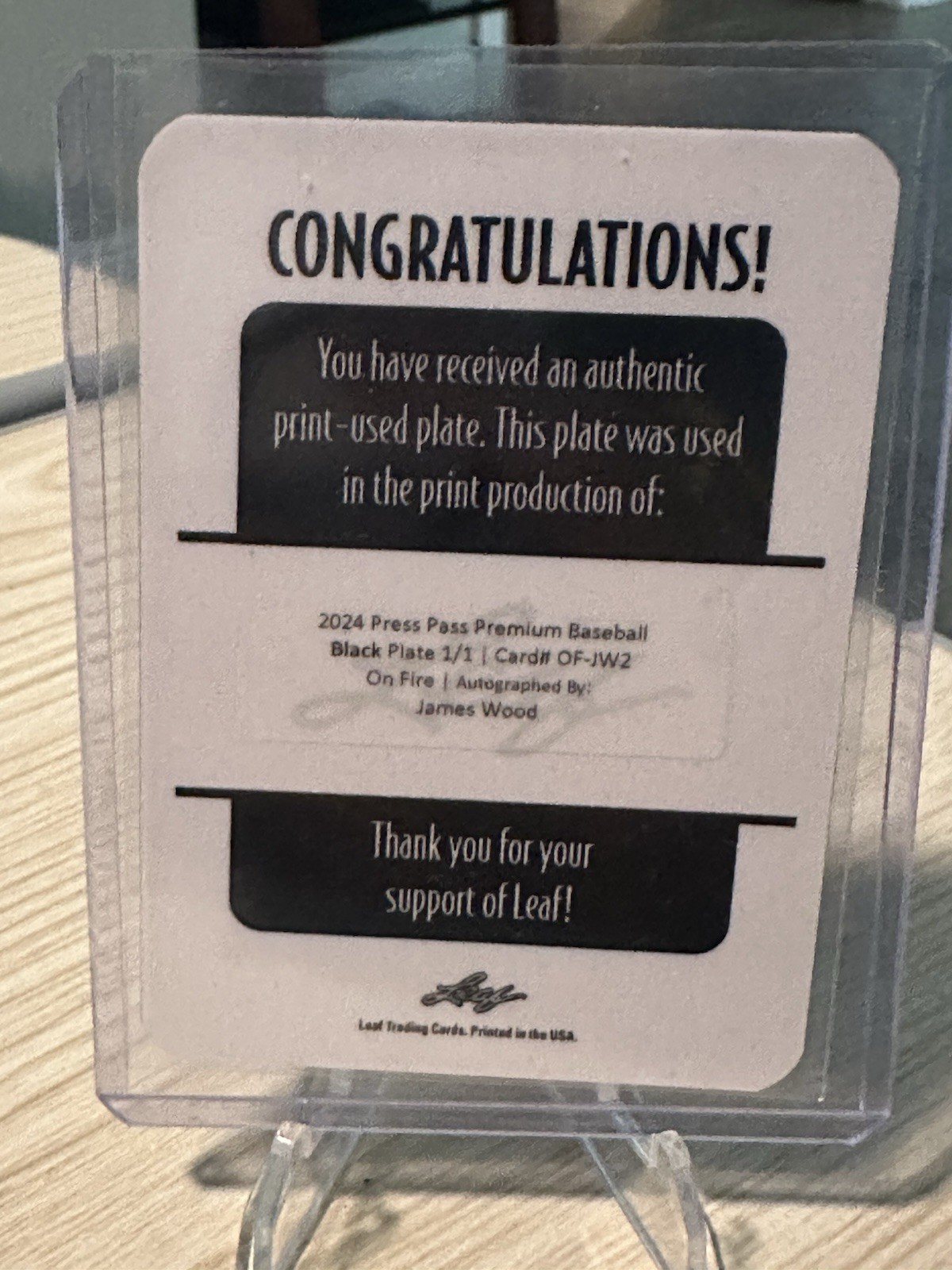 Discover the exclusivity of the 2024 Leaf Press Pass Premium James Wood Auto Black Printing Plate 1/1, a must-have for serious collectors and baseball enthusiasts alike. This rare sports trading card features the promising talent of James Wood, adorned with his authentic autograph, making it a prized possession for fans of the Washington Nationals and MLB alike. The card is further distinguished by its unique black parallel/variety and is serial numbered to signify its one-of-a-kind status. As a part of the distinguished Leaf Press Pass Premium set, this card is hard signed and authenticated by Leaf, ensuring its legitimacy and value for years to come.