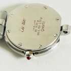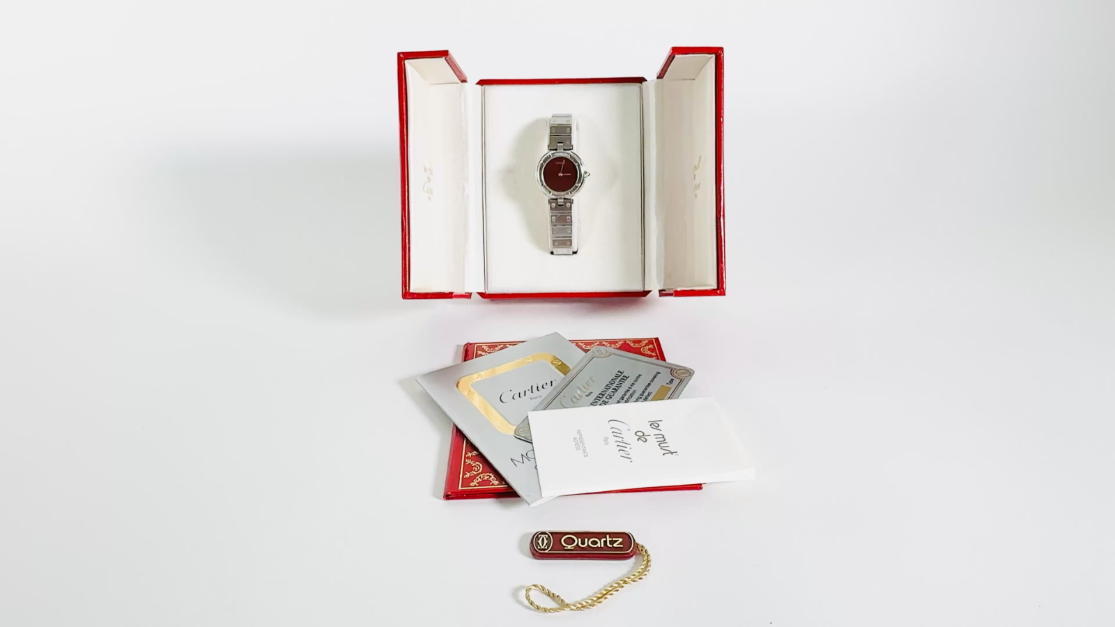 RARE Cartier Santos Vendôme Ronde Quartz 8191 | Full Steel | Burgundy Spider Dial | Burgundy Crown Stone | 27mm Ladies Watch | Complete Set Brand: Cartier Model: Santos Vendôme Ronde Reference: 8191 Movement: Quartz Caliber: Cartier 81 Jewels: 9 Dial: Burgundy Spider Hands: Steel Case: 27mm (excluding crown), Screwback Material: Stainless Steel Bracelet: Cartier Santos Steel Bracelet, 12mm Crown: Burgundy Cabochon Stone Serial Number: 8191****65 Accessories Include: – Cartier Red Presentation Box – Cartier Santos Watches Manual Booklet – Cartier Certificate Guarantee Card – Cartier "Représentants Agréés" Booklet – Cartier Documents Folder – Cartier Quartz Hanging Tag Condition: Excellent vintage condition with minimal signs of wear for its age. The dial is a stunning burgundy spider pattern an extremely rare variation that elevates this timepiece to collector-grade status. This full set Cartier offers timeless elegance and iconic design, perfect for collectors or discerning wearers seeking a statement piece. Please review all photos carefully as they are part of the description. We respond promptly to all inquiries. If you have any questions, don’t hesitate to reach out. If anything is less than perfect, please contact us before leaving feedback. We’re here to help. Thank you for choosing ION Watches. We sincerely appreciate your business.
