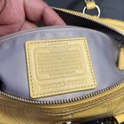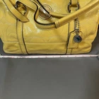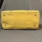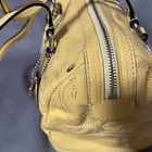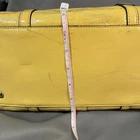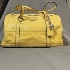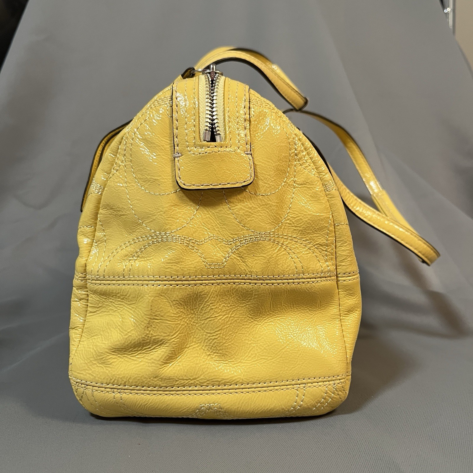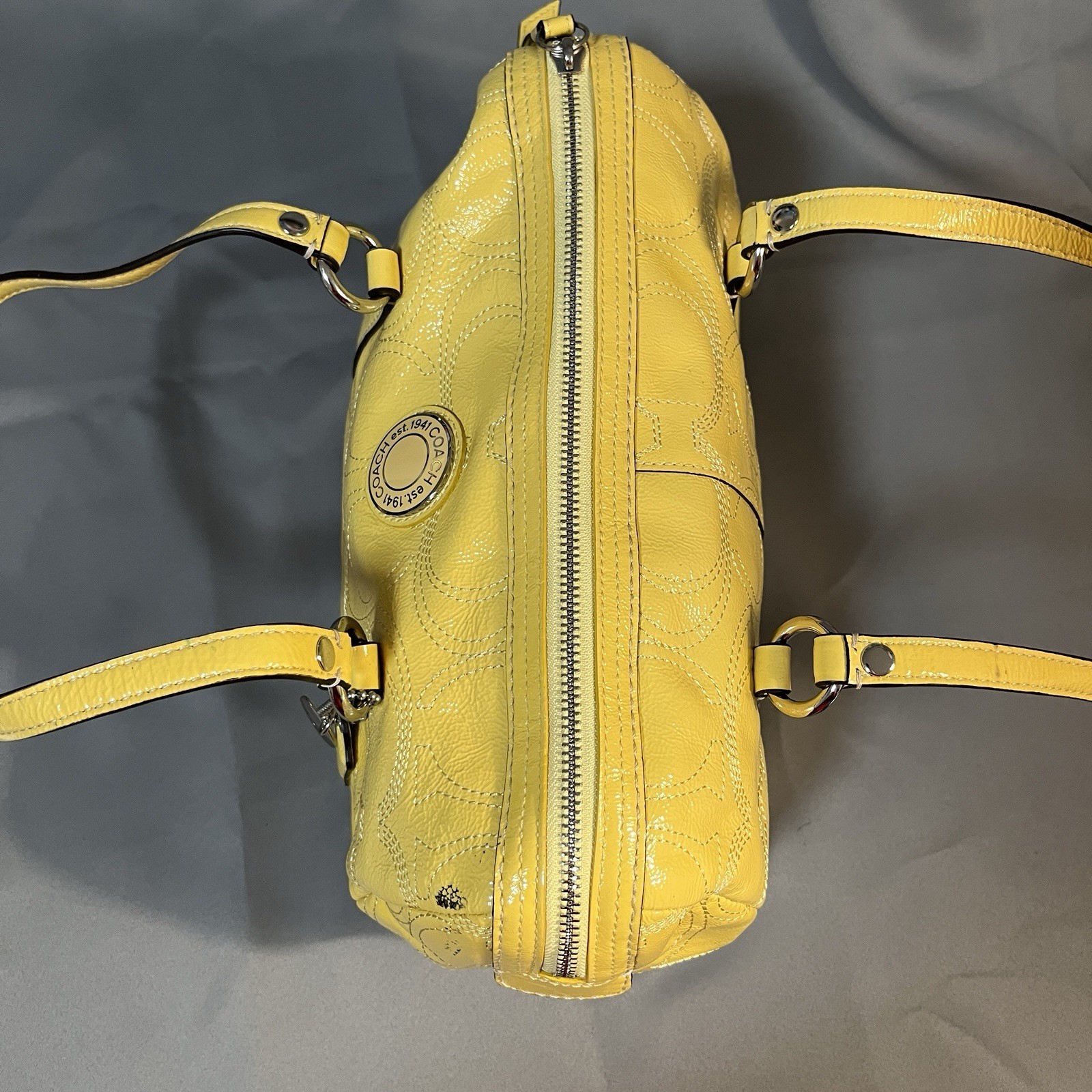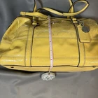 Bright and fun Coach Poppy Patent Leather Satchel (Style F19561) in a vibrant sunshine yellow with embossed signature C design. This bowling-style satchel features silver hardware, double handles, and a pale gray lining. Measurements (approx.): • Width: 12" • Height: 9" • Depth: 6" • Handle drop: 8" Features: • Patent embossed signature leather • Zip top closure • Coach Poppy logo medallion tag • Interior zip pocket + slip pockets • Silver-tone hardware • Protective bottom feet • Double handles for shoulder or hand carry Condition: Preowned with visible wear. Includes black marks on the side panel, creasing, scratches to patent leather, stains, base scuffs, and general signs of use. Handles in good condition and structure remains solid. Interior clean. Fully functional zipper. Please review all photos carefully — priced according to condition. Smoke-free home. Ships fast!