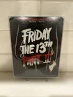 This is a rare Blu-ray steelbook edition of the horror movie "Friday the 13th Part 2" from 1981, directed by Steve Miner. It is a limited 40th-anniversary release featuring a slasher sub-genre, with a runtime of 86 minutes. The film is presented in NTSC video format with an aspect ratio of 16:9. It includes English, French, Spanish, and Portuguese subtitles, along with special features like a behind-the-scenes featurette.