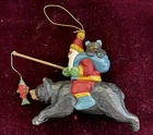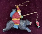 1995 House of Hatten Fishing Santa Riding Bear Christmas Tree Ornament - Susan Smith Folk Art Condition: Charming vintage ornament by designer Susan M. Smith for the House of Hatten. Very good condition. Fishing pole has an "invisible"/plastic string holding fish. Approximate Measurements (inches): Height - 4.75 Width - 6 Depth - 1.75 Check out my other House of Hatten items for sale!