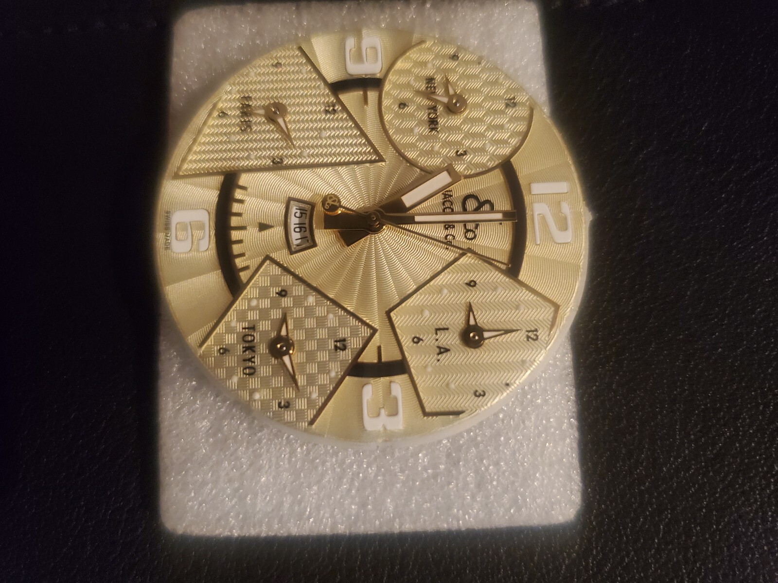 **Under 50 feedback, please contact me before bidding, thank you. I am selling my JC10YG watch dial complete with hands and the quartz movements. This dial/movement came directly out of my JC10yg 47mm 18k gold 5 time zone watch last week. This dial fits the 47mm 5 time zone watches. This dial and all hands were purchased/upgraded and installed directly at the main Jacob and Co. Store in New York. I can provide picture of receipt upon request Condition is very good. I do see 2 tiny black dots on the 2 o'clock white marker on the "LA" part of dial and the 10 o'clock white marker on the "New York" part of dial. It very well may be designed that way as it had the black dots when I originally bought/installed the dial at the Jacob and Co. New York store (see pics on this listing). It's barely visible but I want to mention every little thing. Let me know if you have any questions.