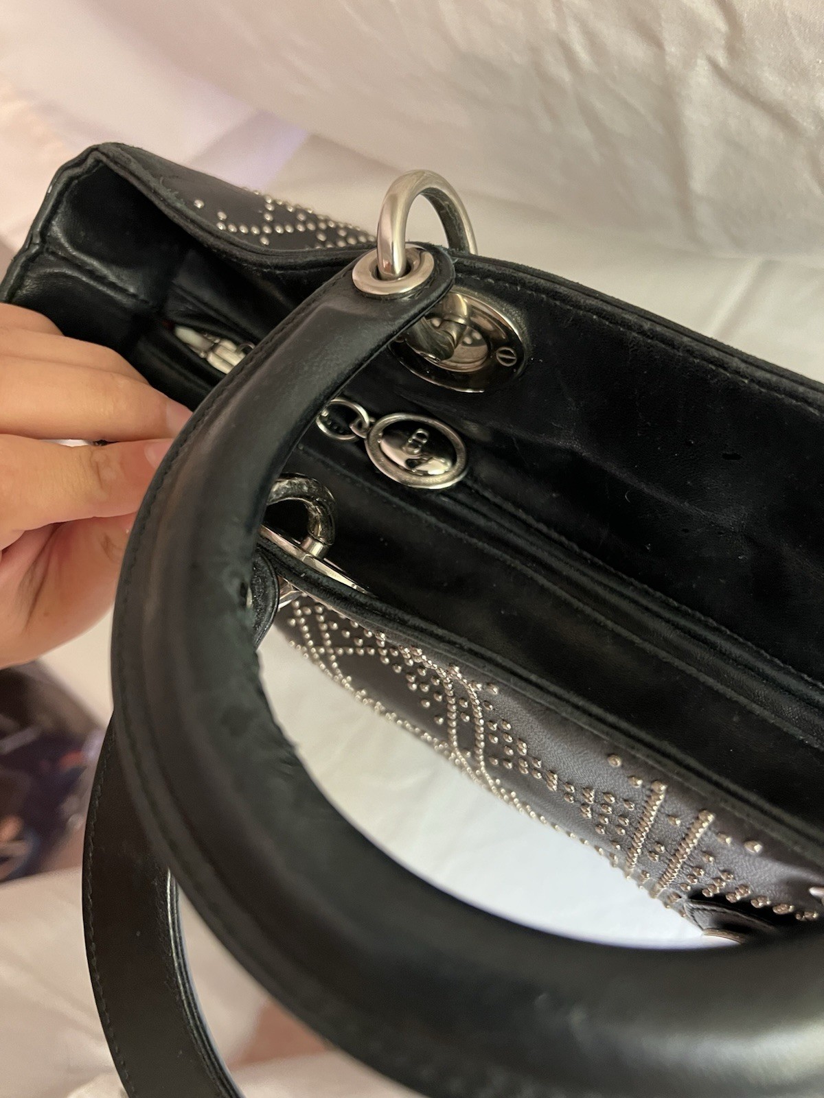 This stunning Lady Dior bag is a dream come true! The black leather with silver studs gives it a chic, edgy vibe while still looking timeless. The craftsmanship is impeccable—luxurious leather, perfect stitching, and that iconic Cannage pattern. Spacious enough for daily essentials but still sleek and elegant. The silver hardware and studs add just the right amount of glam. A true statement piece that turns heads! If you love designer bags, this one is a must-have. Worth every penny!