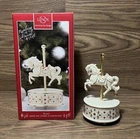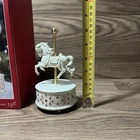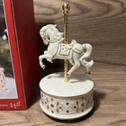 Experience the magic of the season with this rare Lenox Musical Carousel Horse Statue, a charming addition to any collection. Crafted from high-quality porcelain, this large, multicolored piece features Santa Claus on a beautifully detailed horse, complete with a festive snow pattern. The traditional style statue measures 6 inches in length and is perfect for display in any room. The statue is part of the original Lenox Christmas collection and comes with its own packaging, ensuring it remains a treasured keepsake for years to come. But it's not just a visual delight; it also features a musical element that adds a touch of enchantment to your holiday decor. Celebrate all occasions with this timeless piece that brings the spirit of Christmas into your home.