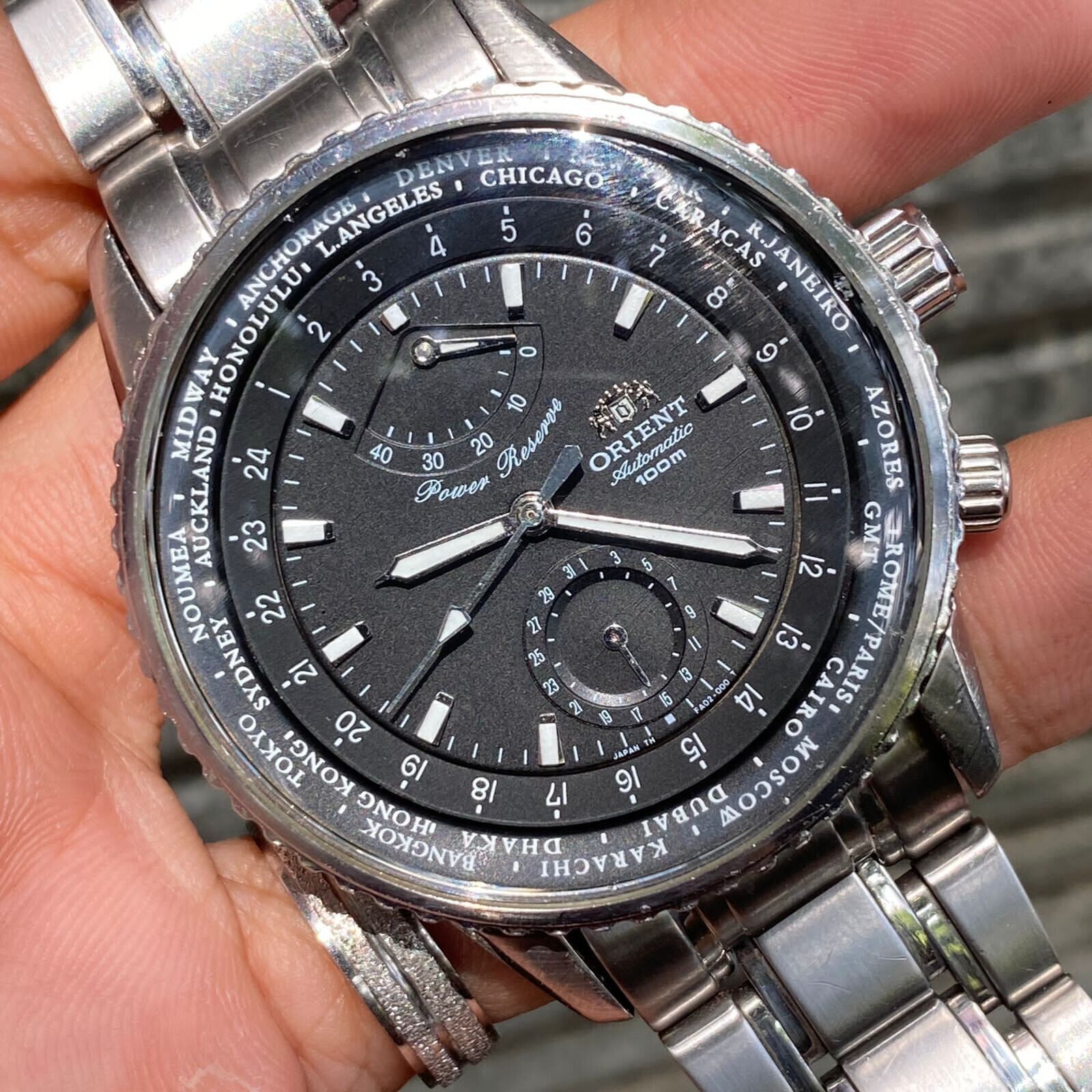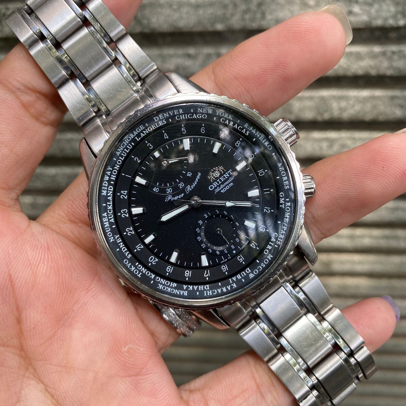 Important Notice for US Customers: Due to new US regulations, all imported items will be subject to import taxes regardless of value. We have no control over customs tax charges and cannot accept complaints regarding these fees. RARE ORIENT Kingmaster FA02-C0 World Timer Chronograph Automatic Black Men Watch This Watch is Preowned with Good Conditon Brand : Orient Ref/Model : Orient Worldtimer Movement : Automatic Dial : Black Case Material : Steel Crown : Original Bracelet : Original Case Size : 45.1 mm Include Crown Condition : Good ( condition according to photo ) Accessories : Watch Only without Box, Without Papers. Please have a look at photos for detail If you have other questions, please contact us. Shipping , Returns and Sales Terms,: ------------------------------------------- We ship worldwide via Fedex or DHL Express We not accept Return We do combine shipping we not responsibility for Import duties, taxes, and charges , so please check in your country's customs office to determine what these additional costs will be prior to bidding or buying. Please check the item condition and photos carefully before buy or make your bid and Please don't buy/bid if you don't have any intention to buy. Once you make your buy/bid, it means that you are willing to buy it and also willing to pay for the final value and shipping cost. Any condition that is not describe on item's description but shown in photos will be considered as described. Sold As Photo, no return accepted. If you bid and win the auction means that you already understand and accept the item condition as describe above. Listing and template services provided by inkFrog