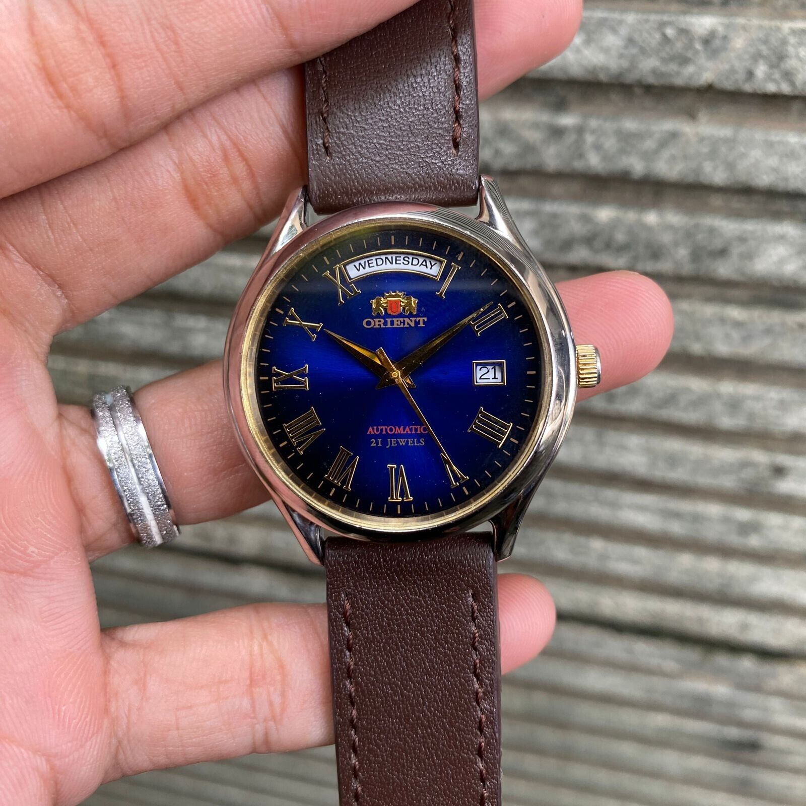 Important Notice for US Customers: Due to new US regulations, all imported items will be subject to import taxes regardless of value. We have no control over customs tax charges and cannot accept complaints regarding these fees. RARE ORIENT President EV0H-A00 Day Date Blue Dial Automatic Leather Vintage This Watch is Preowned with Good Conditon Brand : Orient Ref/Model : Orient President Movement : Automatic Dial : Blue Case Material : Steel Crown : Original Bracelet : AM Case Size : 38.6 mm Include Crown Condition : Good ( condition according to photo ) Accessories : Watch Only without Box, Without Papers. Please have a look at photos for detail If you have other questions, please contact us. Shipping , Returns and Sales Terms,: ------------------------------------------- We ship worldwide via Fedex or DHL Express We not accept Return We do combine shipping we not responsibility for Import duties, taxes, and charges , so please check in your country's customs office to determine what these additional costs will be prior to bidding or buying. Please check the item condition and photos carefully before buy or make your bid and Please don't buy/bid if you don't have any intention to buy. Once you make your buy/bid, it means that you are willing to buy it and also willing to pay for the final value and shipping cost. Any condition that is not describe on item's description but shown in photos will be considered as described. Sold As Photo, no return accepted. If you bid and win the auction means that you already understand and accept the item condition as describe above. Listing and template services provided by inkFrog