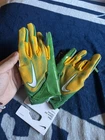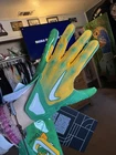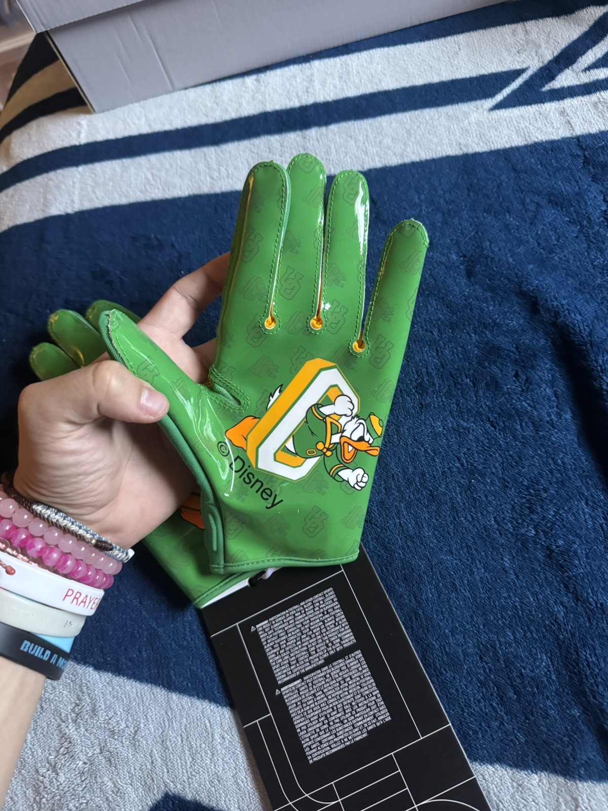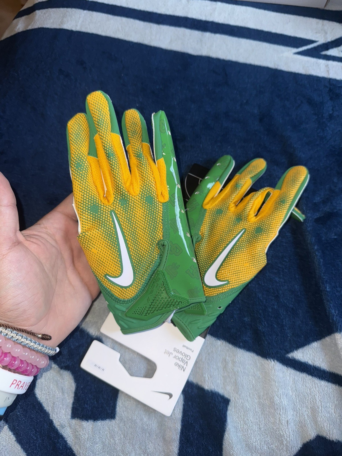 The product is a rare pair of Oregon Ducks Nike Vapor Jet 7.0 Team Issued 'Disney' football gloves in size medium. These officially licensed gloves are in the team colors of green and are designed for all players to use during the regular season. The gloves feature the iconic Nike swoosh and are specifically tailored for the Oregon Ducks team, making them a unique and sought-after item for fans and players alike.