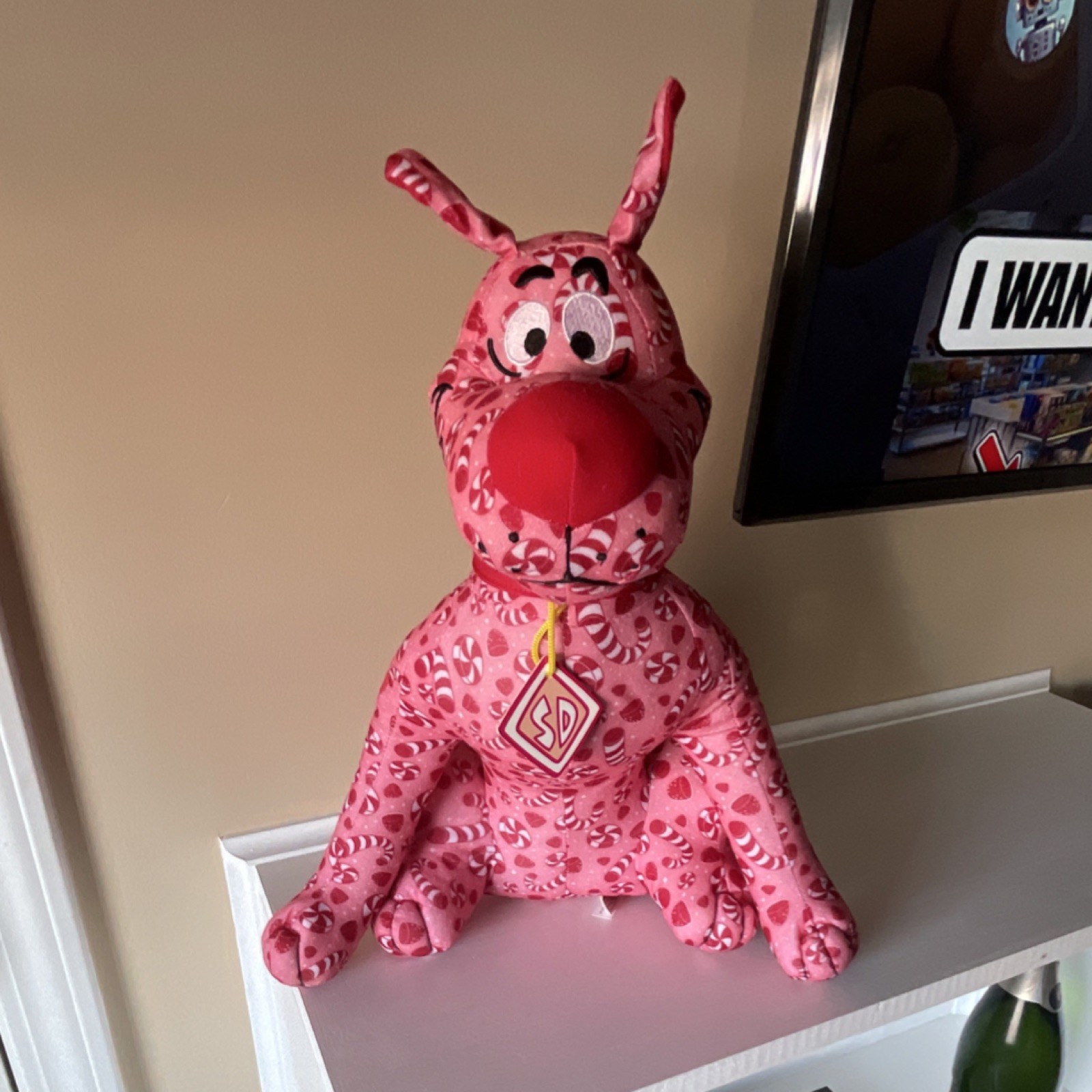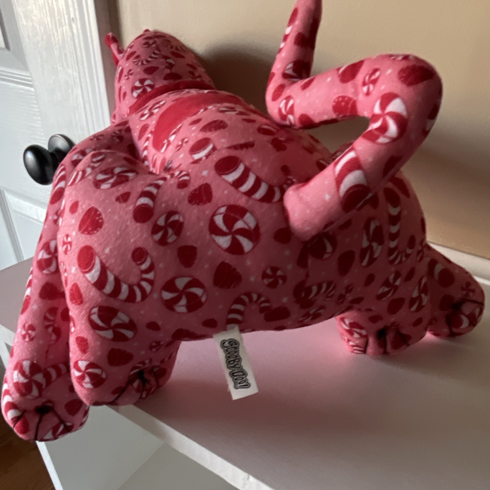 The product is a Scooby-Doo Pink Plush Toy with a candy pattern, featuring the popular Hanna-Barbera character Scooby-Doo in a cute and colorful design. Made of plush material, this collectible item is perfect for fans of the Scooby-Doo franchise and TV show. The pink, red, and white color scheme adds a playful touch to this adorable plush toy, making it a fun addition to any animation or Scooby-Doo memorabilia collection.