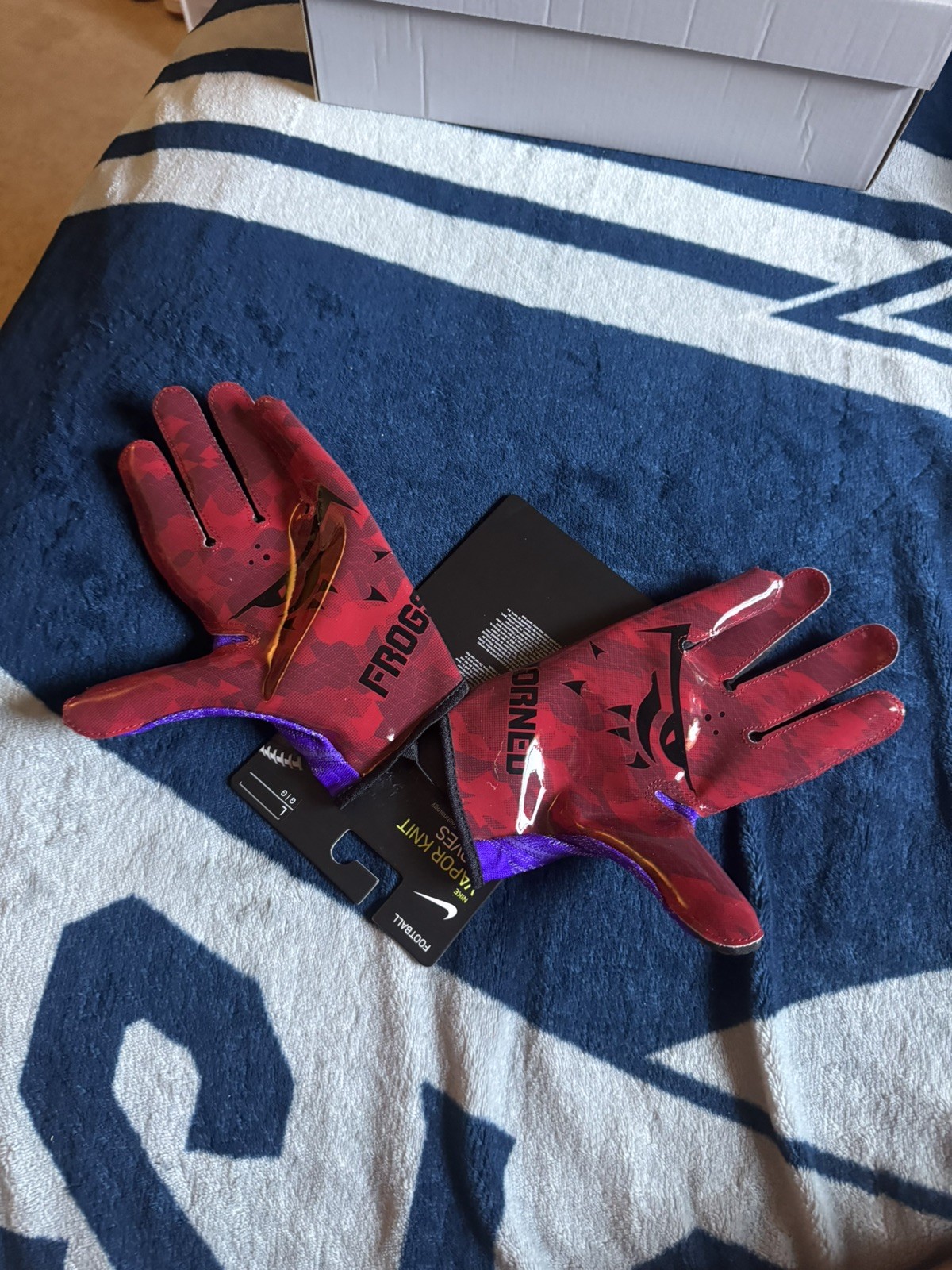 The product is a rare Nike Vapor Knit football glove in the 'RED/WAR' color scheme, officially licensed by the TCU Horned Frogs. Designed for all players, the size is large and suitable for men. The gloves are made in China and feature team issue design, making them a unique and collectible item for fans of the TCU Horned Frogs football team. With the iconic Nike brand and official team licensing, these gloves are a must-have for any passionate football supporter.