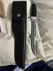 This is a rare vintage Buck USA Model #120 Special fixed blade knife with a stainless steel clip point blade over 5 inches long. It features a half tang, ambidextrous dexterity, and comes with a sheath. The handle is made of phenolic, and it is an original USA-made piece. The knife is brand new in box. Dust included.