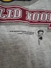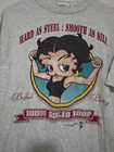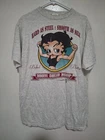 This *RARE* vintage 1994 Y2K Betty Boop Tee features a Graphic Print of Buffed Betty on a gray cotton T-shirt. The short sleeve shirt has a Crew Neck and a regular fit in size Large. It is a classic 90s cartoon-themed piece with a logo accent, suitable for all seasons. Made in the United States, this collectible item is a must-have for any Betty Boop fan.