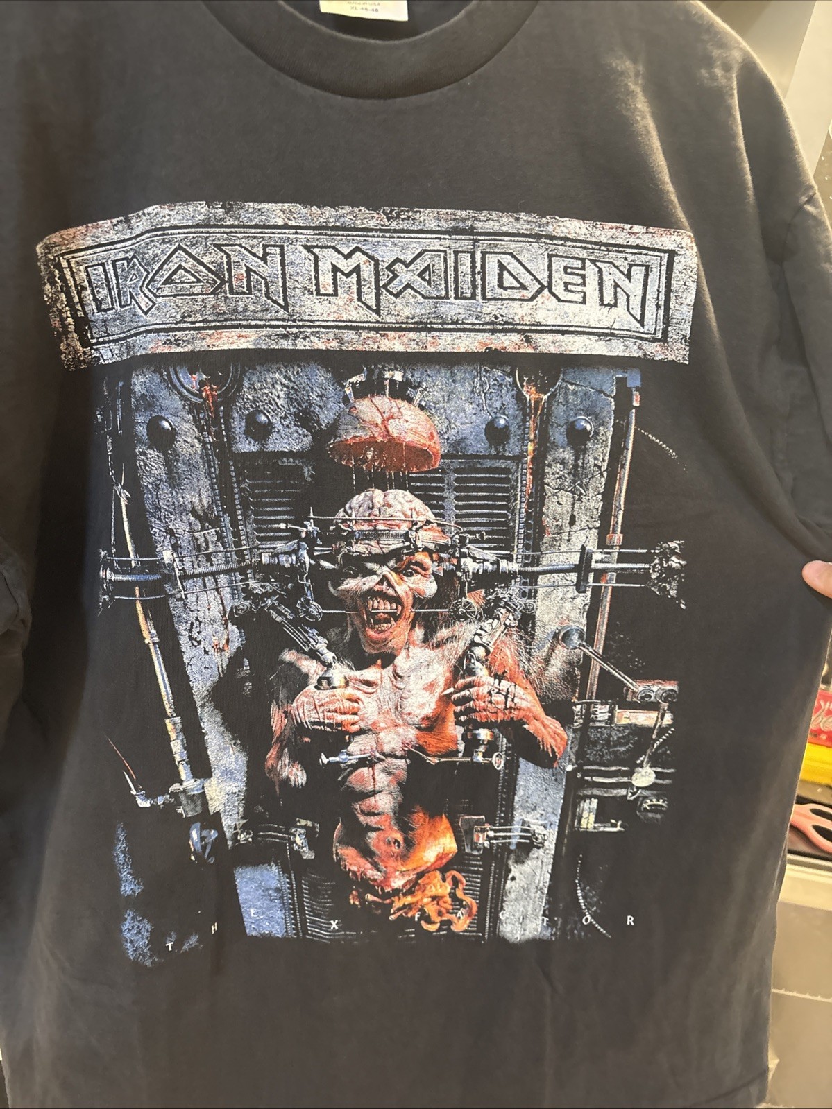 This rare vintage 1995 style single stitch Iron Maiden The X Factor All Over Print (AOP) boot tee is a must-have for any rock music collector or fan of the iconic band. Made of cotton with a crew neck and short sleeves, this black tee features a graphic print of the band's logo on the front and back. The XL size and regular fit make it a comfortable and stylish addition to any wardrobe, perfect for all seasons and easy to care for. Made by Hanes in the United States, this tee captures the essence of 90s rock music and is a unique piece for any fan of Iron Maiden.