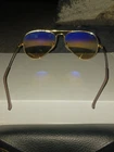 These are Ray-Ban Aviator sunglasses with a gold metal frame and lightly smoked tinted lenses. They have a vintage look and are designed for both men and women. The model is the Ray-Ban Aviator.