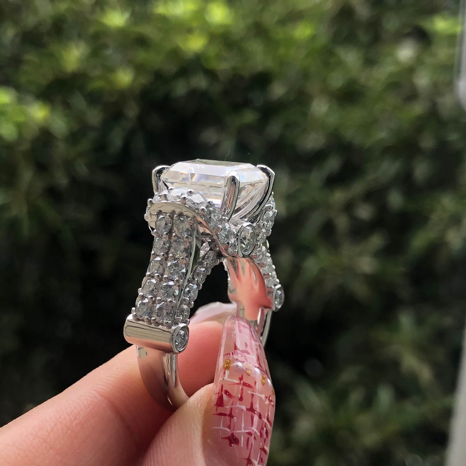 " READY To Ship Size 8 3/4 - 6 Carat Emerald Cut Moissanite Ring D Colorless VVS 9.3 CTW - 14K Solid White Gold with Sharp Claws Only 1 available. This ring will be shipped within 48 hours. Will deliver 2-7 days via FedEx Express for FREE. ๐ฅ๐ฅ๐ฅ๐ฅ๐ฅ Other sizes require customization for 2-3 weeks. Message me for other sizes or metals. ๐ Available Metals: Solid 10K Gold โ HIGHEST QUALITY Certified White Gold, Rose Gold, Yellow Gold & 950 Platinum. (Not Trash). ๐ Ring Size: 2,3,4,5,6,7,8,9,10,11,12,13,14,15,16 and anything between these ring sizes available. It could be 1/4, 1/2, or 3/4. We Fit It to your Exact Finger Size no matter what size you want. ๐ Main Stone: HARDEST Quality VVS GRA Certified Hand Cut Moissanite (Pass Diamond Testers) โจ Side Stones: Premium Quality VVS Moissanite. (Pass Diamond Testers) ๐ Certified: GRA - GRC ๐ Polish: Excellent Polish. Shiny & Clean for Maximizing Sparkles. โฆ Cut: Hand cut Excellent cut & Symmetry with Crisp & Sharp Edges/Corners. ____________________ ๐ 100% Handmade with GORGEOUS & Accurate Details. Itโs an Art, not only a Valuable Material. ๐ 60 Days Money Back Guarantee for Any Reason even if you don't Fall In Love with it. ๐คฏ FREE LIFETIME Main Stone Warranty & Side Stone Replacement. (No Color Change). ๐ FREE LIFETIME Jewelry Cleaning & Re-plating. ๐ Hypoallergenic. Skin Friendly. Doesnโt cause any type of Allergies. ๐ Customizable with/to Your Favorite Stone/Jewelry Type & Shape. ๐ FREE STUNNING Random GIFTS On Every Order (we sell them for +$200 up to over +$700). ๐ฅฐ Amazing Wooden Gift Boxes for Your Main Jewel & its Gifts. ๐ฅณ Gift Wrapping Available (we wrap with no tags or receipts, ready to present). ๐คฉ VIP Customer Service to Make Your Dreams Come True in the Most Fantastic Way. ๐ FREE SUPER FAST FedEx Express Shipping. ____________________ ๐โ + Our 5X Platinum Vermeil: Platinum is 9.4 times RARER & slightly more DURABLE than gold. Rings with platinum end up more EXPENSIVE than gold because the DENSITY of platinum is a lot HIGHER and the QUALITY is EXTREMELY PURER. Rings THICKLY plated FIVE TIMES with platinum offer MUCH STRONGER PROTECTION against wear and scratches than gold plated jewelry. Therefore they LAST the LONGEST while giving you a SHINY LOOK ALL THE TIME. ๐โ + Our Rare Stone Quality: Here you have the NATURAL looking color of the diamonds in a RARE size with extraordinary VVS1 clarityโฆ Weโre offering the GREATEST QUALITY and VALUE at the BEST PRICE with this design by using very SPECIAL types of GRA Certified Moissanite stones. Natural diamonds in this color, clarity and size are super rare and very hard to find. Some of them easily cost over $10,000 per carat. (please message me for natural diamonds like this color, size and shape so I can give you the accurate price based on your preferences) ____________________ ๐ข๐๐ FREE FAST EXPRESS SHIPPING Processing + Shipping = Receiving Time PROCESSING: Only 1 available. This ring will be shipped within 48 hours. (Other sizes require customization for 2-3 weeks. ) SHIPPING: 2-6 days via FedEx Express for FREE โ Youโll get updated with the tracking code, once your package is shipped. โ We ship with insured FedEx only which is very secure. โ An adult signature is required at the time of delivery. _____________________ โ๐๐ CUSTOMIZATION/PERSONALIZATION: Custom orders with me are SUPER EASY & COMFORTABLE, no matter if youโve never done it before or youโve done lots of them. ๐ค I break down everything into small steps. And we go through the steps one by one together. On each step, youโll get to pick or guide me from the options I represent. ๐ Once we get to the end, your dream comes true. ๐คฉ๐ Because every single detail is just exactly what you want. ๐๐ ๐จ HOW TO DESIGN YOUR RING: A โ Send me some/one image similar to your idea. Or tell me whatโs your favorite shank, profile or stone? So I can show you some options to choose from. B โ Next, I will start designing it right away. Iโll send you some screen shots from what I designed. We can adjust any part of it together, until itโs exactly the way you want it to be. C โ After we get to the ideal conclusion, Iโll render several Ultra High Quality 3D images and a 4K video, so you see what the end result is gonna look like in reality. D โ The moment you approve everything, we start making it. Once itโs finished, weโll ship it the same day. + 3D IMAGE SAMPLES: Before you order yours, you can ask me for some samples of the 3D rendered images and videos. Youโre gonna absolutely love the quality, because they look like real rings. ๐คฉ๐ + Designing your dream ring with me is gonna be a fantastic experience. While you just sit and order, youโll watch how I take care of everything from your idea to the end product in the SIMPLEST & GREATEST way possible.โ โ------------ ๐ AVAILABLE GEMS: All stones are available - Colorless & Colorful Moissanite or Simulated Moissanite. Natural & Lab Grown Diamonds in Colorless or Colorful. Natural and Lab made Emerald, Ruby, Sapphire, Amethyst, etc. Just ask! ๐ฅ AVAILABLE METALS: All metals are available - 925 Sterling Silver, 5X Platinum Vermeil, 9K Solid Gold, 10K Solid Gold,14K Solid Gold, 18K Solid Gold (in Rose, White or Yellow), Platinum 950. ๐ AVAILABLE MATCHING PIECES: We can make matching pieces for this product. Engagement Rings, Bridal Sets, Wedding Bands, Earrings, Studs, Hoops, Bracelets, Bangles, Necklaces, Pendants, and anything youโd dream of. We can design all to set with this item. ๐จ๐จ๐ง๐ฆ AVAILABLE OTHER JEWELRY: We make jewelry as per occasion and celebration like birthdays, birth months, anniversaries, motherโs day, valentine's day, fatherโs day, memorials, thanksgiving, zodiac signs, graduation days, and many more per your request. ____________________ โโโโโ 5 STAR 