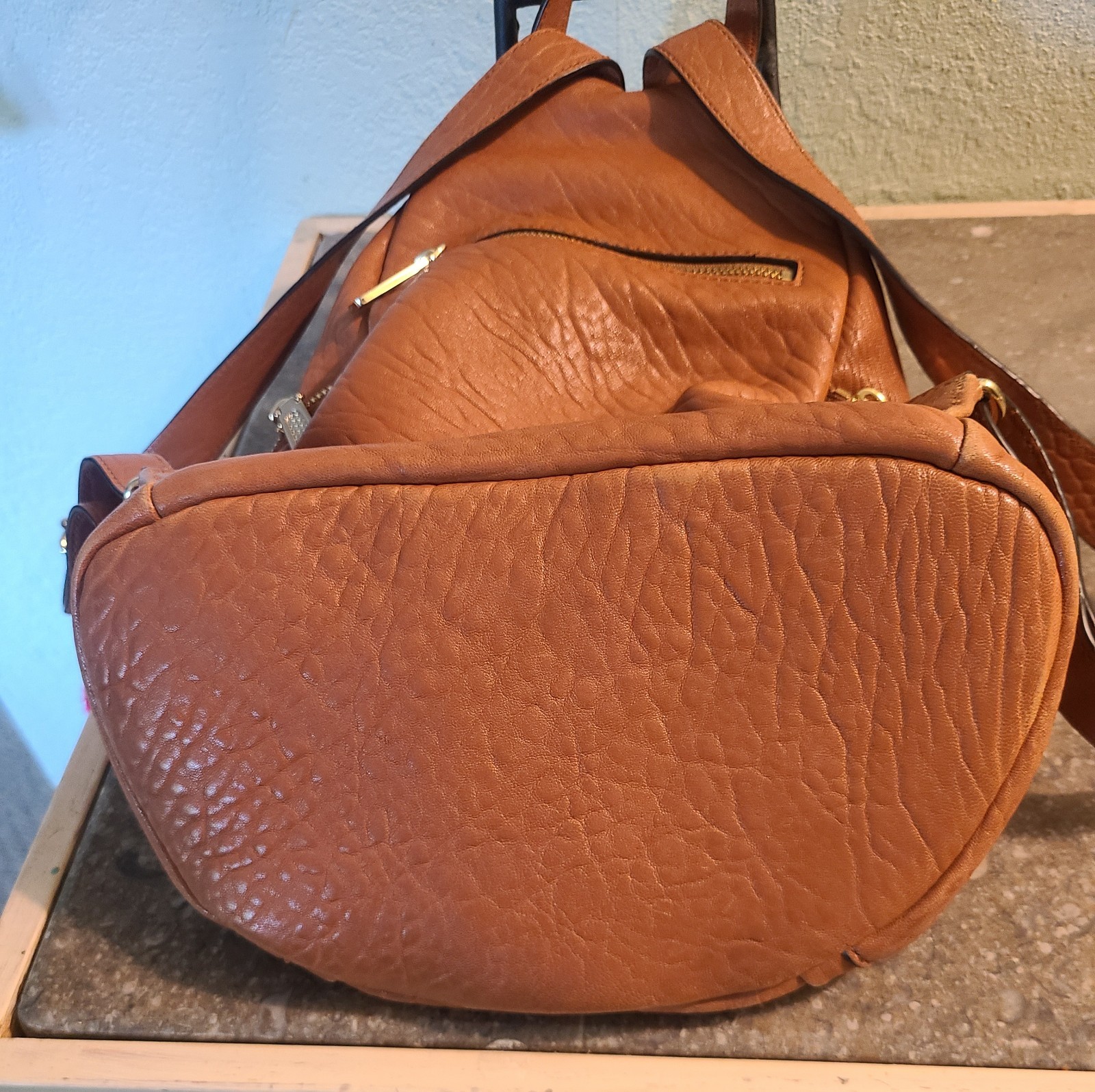 Rebecca Minkoff Jumbo Julian Backpack in Caramello colored leather. Perfect for everyday use, it offers both style and functionality. Features a zipped closure, two side zippered pockets, spring lock, and fully adjustable straps. The interior has a zippered pocket and three slip pockets. Measures approximately 15"h x 10"w x 6". The backpack is in excellent pre-loved condition. Hardware is scratch free and tarnish free, the interior is in very clean and stain free. There are 2 tiny spots of wear on back corners. Stored in a non-smoking home, and I consider all offers.