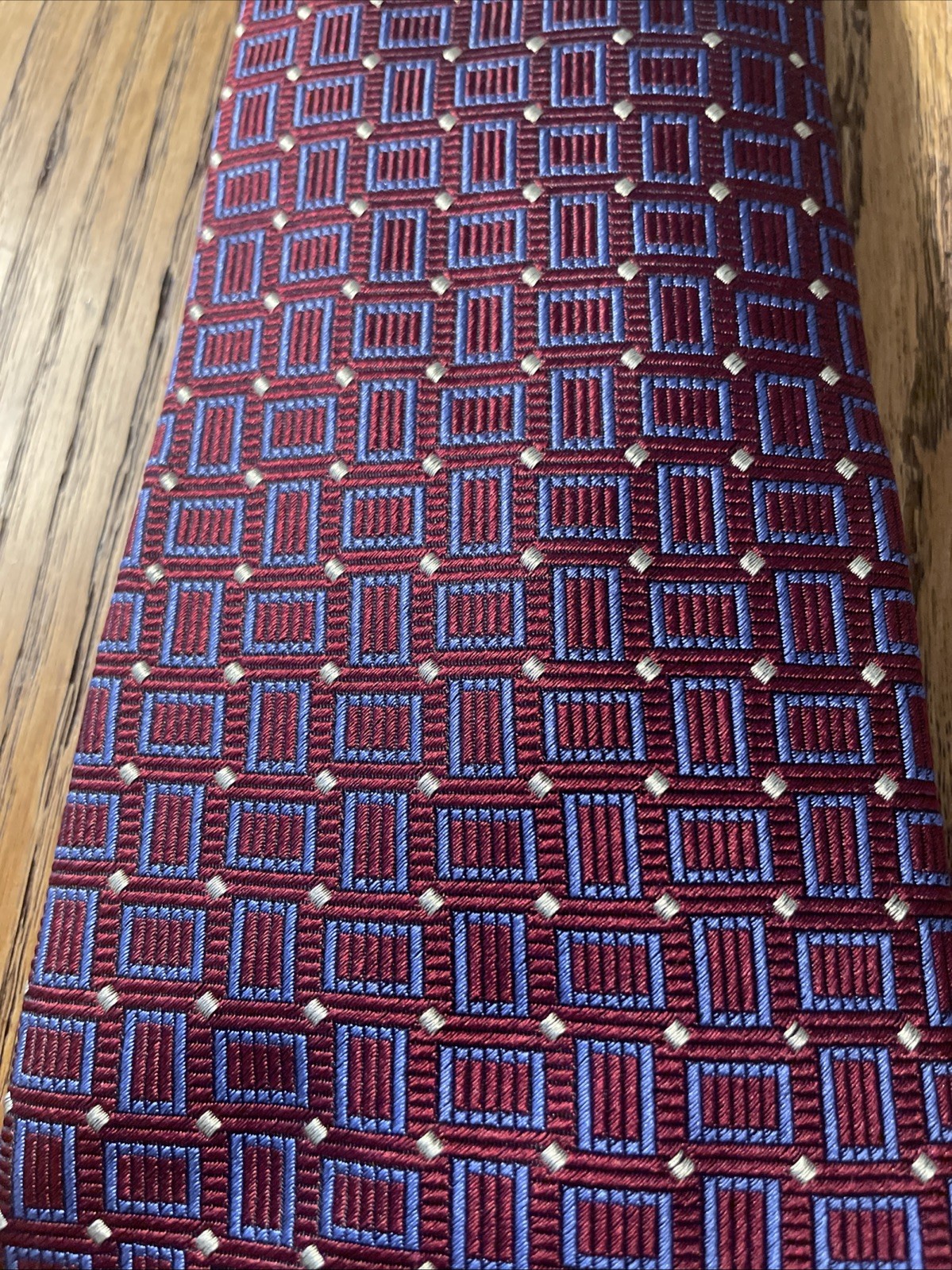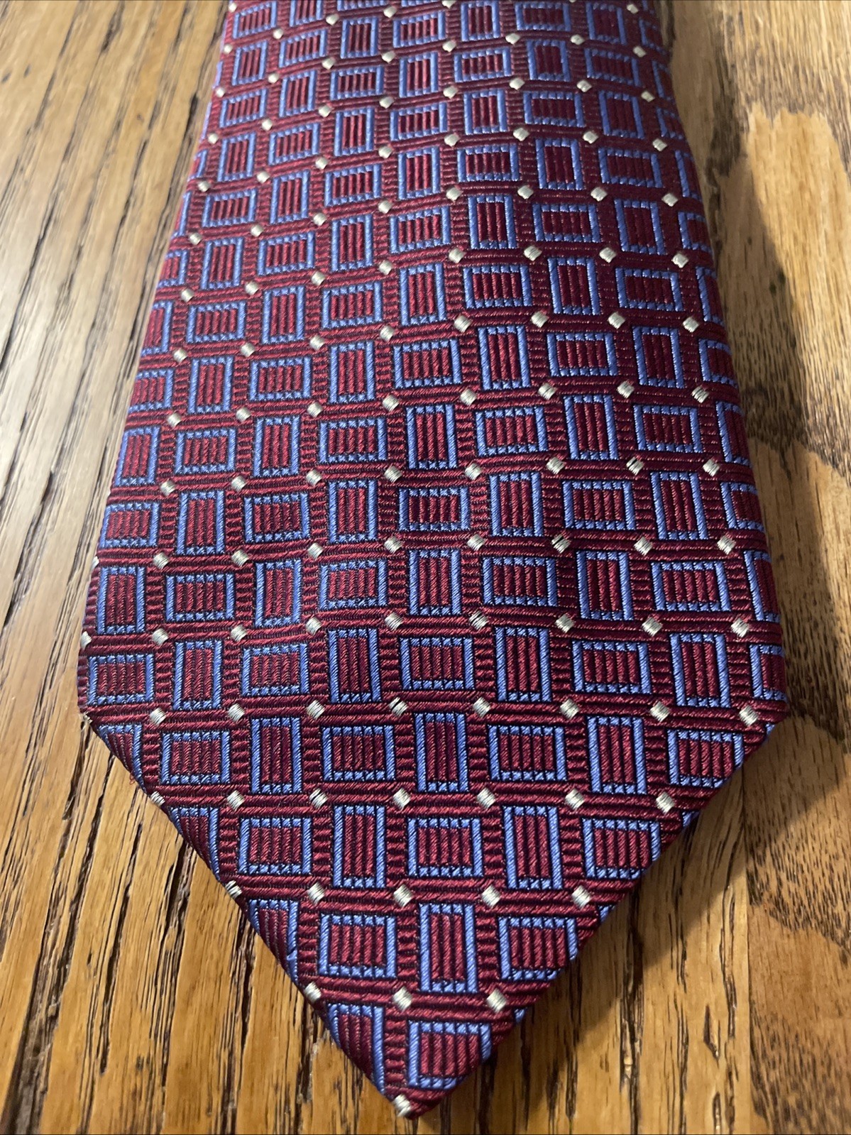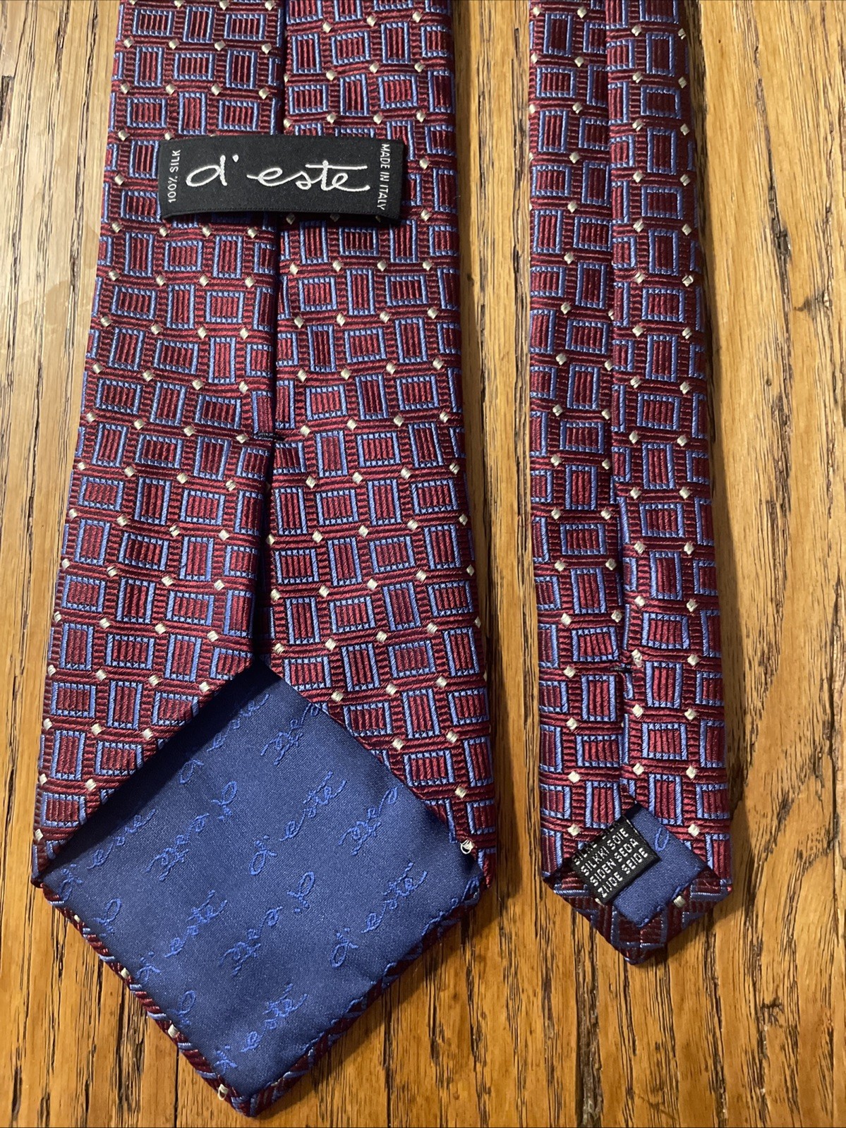 The D’este Thick Geometric Woven Silk Tie Necktie is a designer accessory handcrafted in Italy. This multicolor necktie features a classic width and a preppy style, perfect for a sophisticated and polished look. Made from 100% silk, this tie is a luxurious addition to any man's wardrobe, adding a touch of elegance to any outfit. With its geometric pattern and high-quality craftsmanship, this tie is a stylish choice for formal occasions or professional settings.