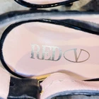 Brand: RED V Origin: Made in Italy Size: EU 37 (approximately US Womens 7) Color: Black upper with light pink insole and outsole Materials/Markings: Leather sole stamped "Vero Cuoio"; outsole marked "Vero Cuoio Made in Italy 37"; insole stamped "RED V" Style: Slingback peep-toe pumps with bow at the vamp and high stiletto heel Design details: Textured/dotted leather upper with glossy heel and toe cap look; adjustable buckle slingback Use: Elegant dress/party/cocktail heels Notes: EU 37 generally corresponds to US Womens 6.5–7; please verify preferred fit.