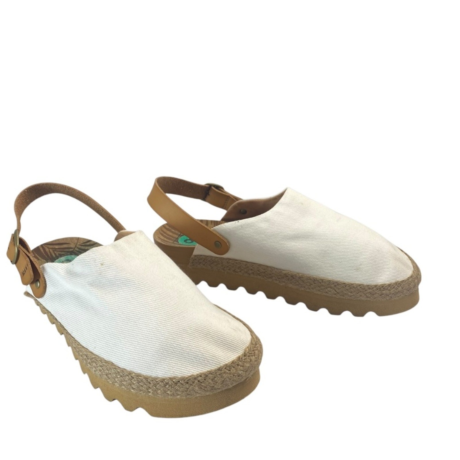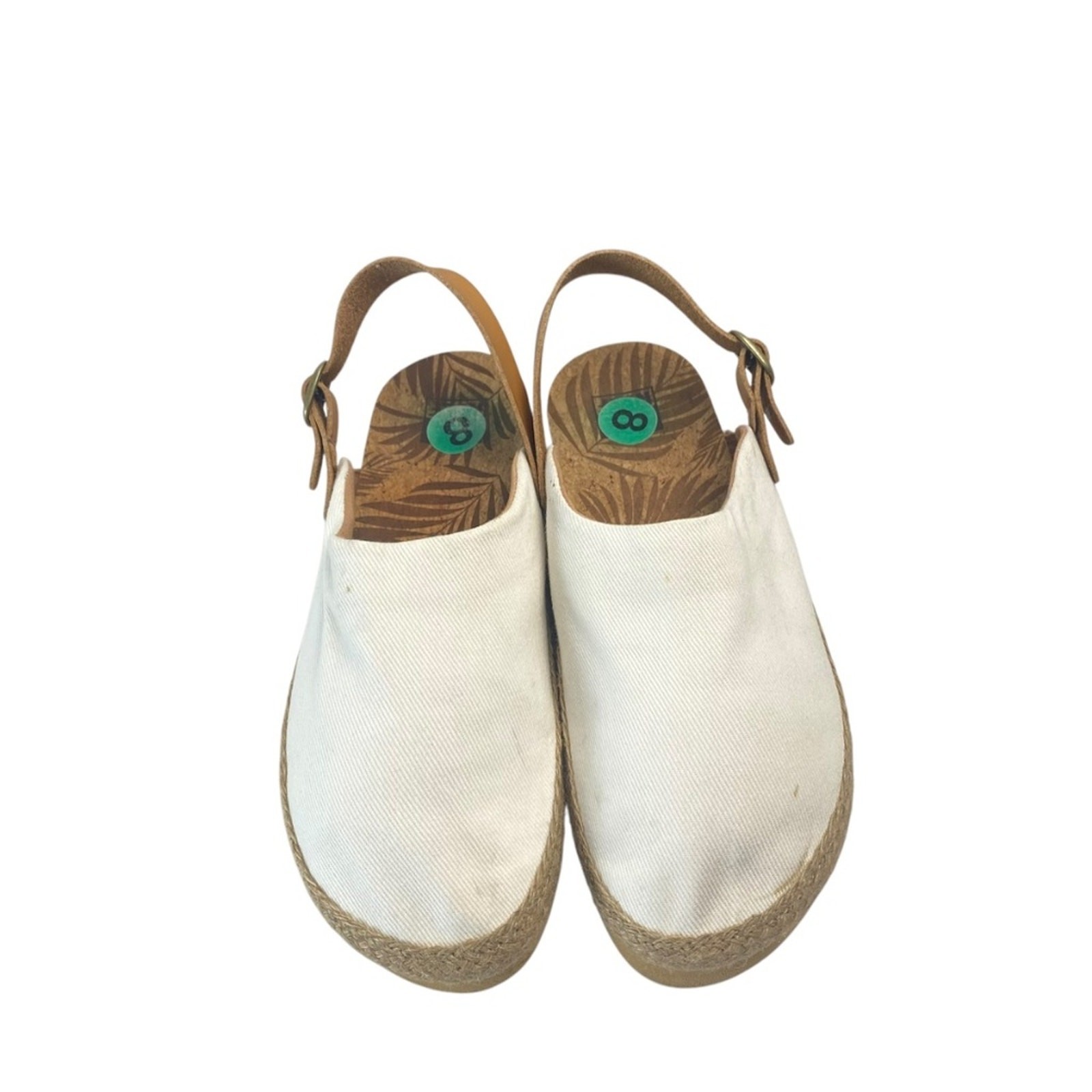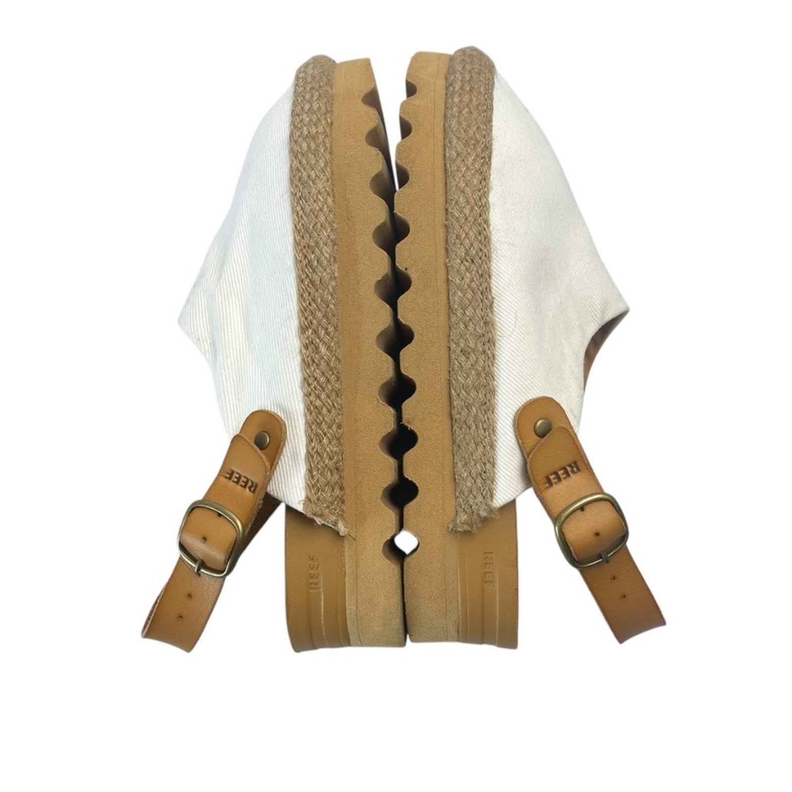 REEF Women's Cushion Sage Slingback Espadrille Platform Flats Size 8 Color: White/Tan Condition: Pre-Owned in great used condition. Minimal wear - Round-toe slip-on slingback espadrille flats with adjustable buckle closure - Espadrille plaiting at platform - Cushioning, rebound support, arch support and a deep heel cup for added comfort - Cotton/manmade upper; cotton lining; cork sockliner; rubber sole If you require clarification on any point, or if you believe any information presented is inaccurate or misleading, please contact me