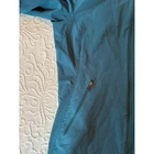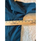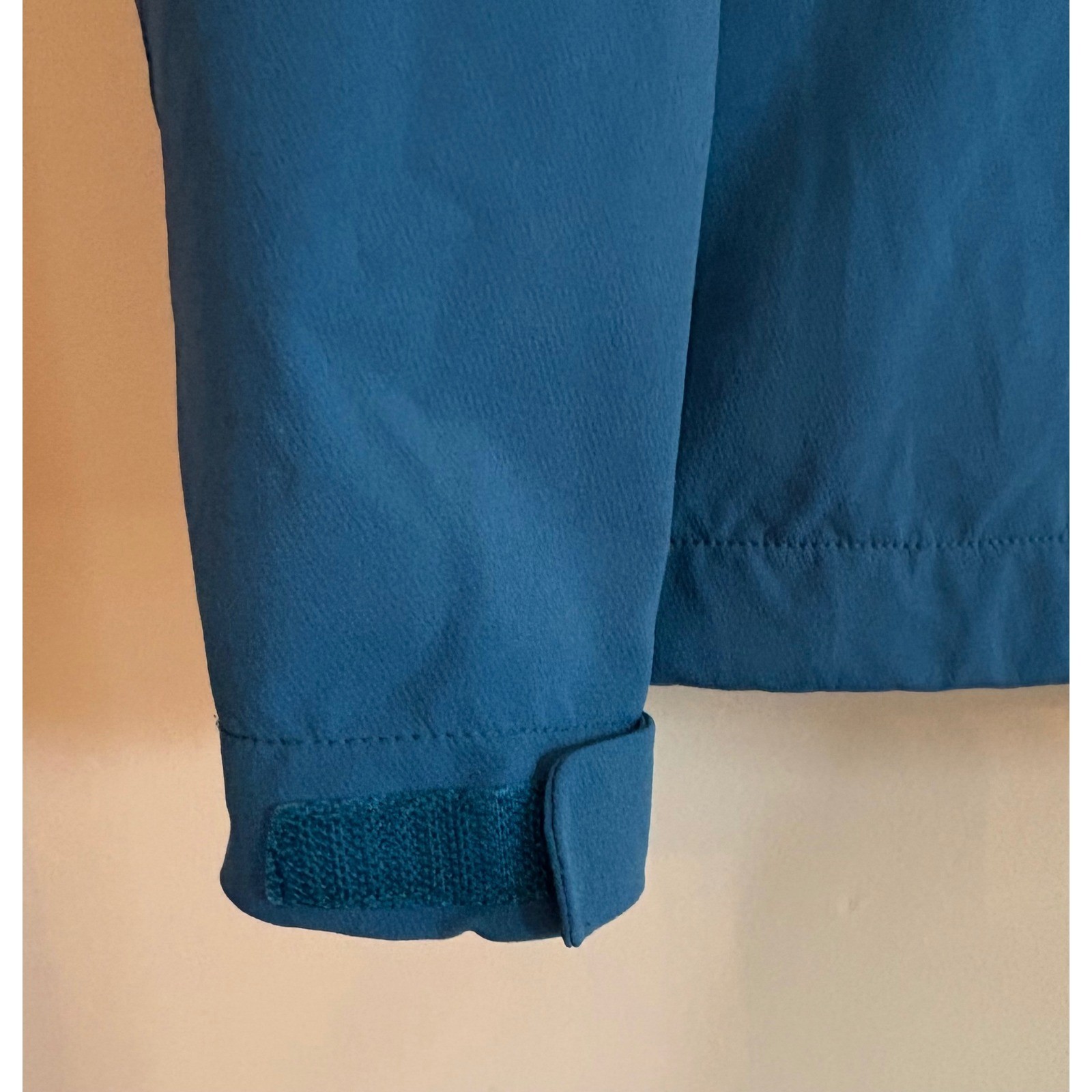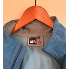 Teal blue REI hooded jacket, size large. Tapers at the waist (see photos). Besides the hood, the bottom of the jacket also has a drawstring to tighten/adjust the bottom of the jacket -- and the bottom of the sleeve are adjustable (see photos). Besides the 2 hand pockets, there is a small left lower arm pocket for keys or other small items. There is a collar to help protect the neck from the weather, even if the hood is not used. Wind and water resistance. See photos for pit to pit measurement. Materials is nylon, polyester, and Spandex.