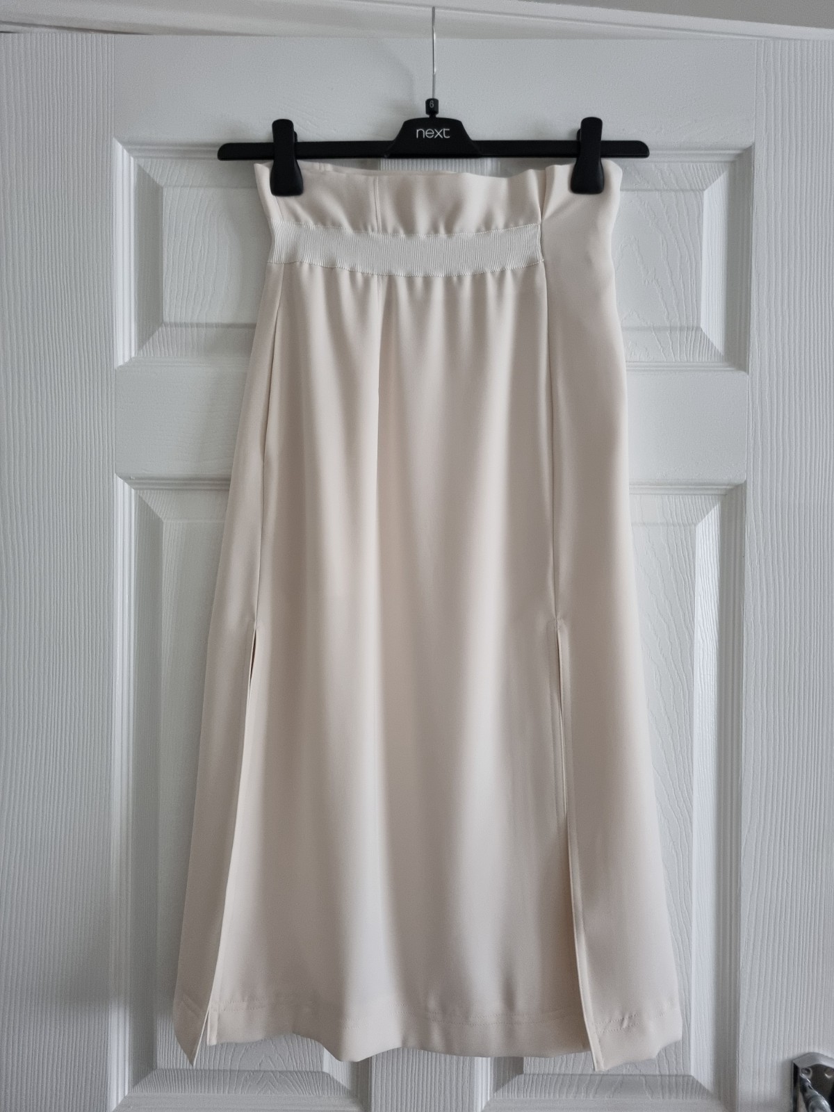 The REISS Toni midi skirt in size 8 is a stylish and elegant option for women's wardrobe. This high-rise ivory skirt features a front slit accent and convenient pockets, giving it a fashionable and practical design. Made from polyester, it is perfect for everyday wear or special occasions. The skirt is new without tags, making it a great addition for those looking for a versatile and chic piece.