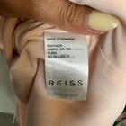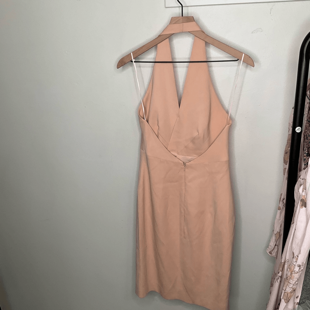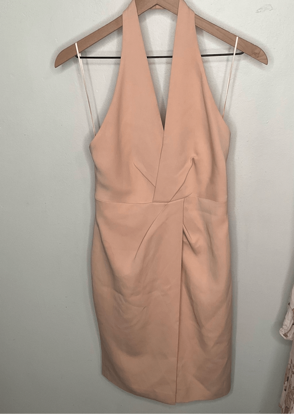 REISS Yuma Twist-Front Halter Dress • viscose/elasthane • Crossover halter V-neck, sleeveless, fixed front twist • Seamed waist, crossover skirt, offset front vent • Darted back, sheath silhouette, concealed zip back closure Self tanner on edges, see photos Color: Peach Size: 6 Good Condition