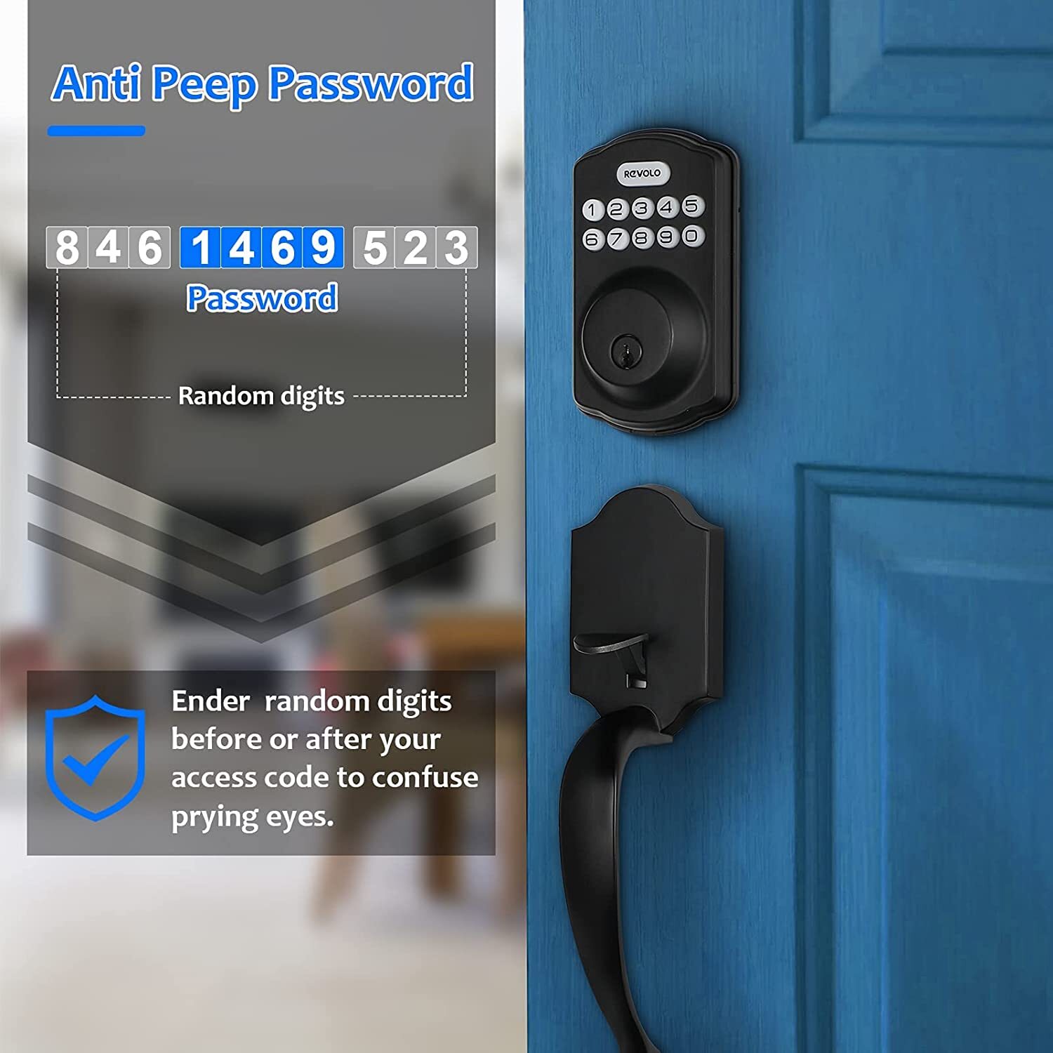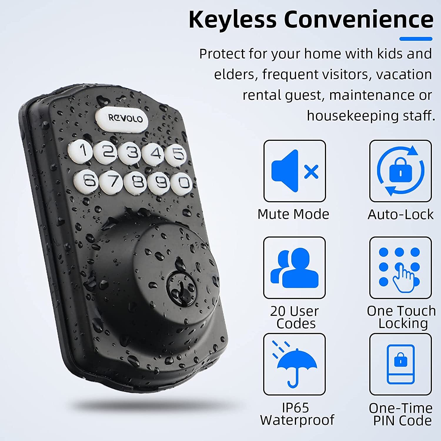 REVELO Electronic Keypad Deadbolt Keyless Entry Door Lock w Handle Black 4235A2E REVELO Electronic Keypad Deadbolt Keyless Entry Door Lock w Handle Black 4235A2E * NEW Factory Sealed ** Specifications below are taken directly from the manufacturer website ** Revolo Electronic Keypad Deadbolt, Keyless Entry Door Lock,Keyed Entry,Auto Lock, Door Lock with Handle, Front Door Handle Sets, Anti-Peeking Password (Black) Keyless Entry Lock: This keypad lock provides 20 access codes for family use and available temporary code for guest single entry. This keypad door lock also allows you to set the door to automatically lock after 10 to 99 seconds or apply 1 touch motorized locking, so you never have to worry about whether you locked your door Auto-Locking: Anti-peeking password protects your home security, automatic door lock or one-touch auto-lock effectively avoid incomplete lock. Easy Installation: Adjustable latch to fit mostly standard door preparations, includes necessary hardware components. Easy to install with a Phillips head screwdriver. High quality design: This digital combination lock adds taste to your building with its own unique shape and high-quality atmospheric handle combination.You do not need to buy extra door handle. Built to Last: With a sturdy zinc alloy and stainless steel frame, Electronic Keypad Deadbolt is tested to handle the comings and goings of a busy household for over 30 years. The IP65 rating ensures that come rain or shine, your front door is protected. Item Condition Definitions: NEW = Manufacturer Sealed Packaging NEW (OTHER) "OPEN BOX" = The manufacturer packaging has been opened. The item is NEW / NEVER USED and includes all original accessories as well as packaging. OPEN BOX = Manufacturer Packaging has been opened. Item was open strictly for limited testing purposes and shows no signs of wear or damage. All original accessories are included. Shipping: My handling time is 3 days ... that is the maximum ... many items ship sooner. Shipping will be through UPS or USPS depending on which is more economical. Listing and template services provided by inkFrog