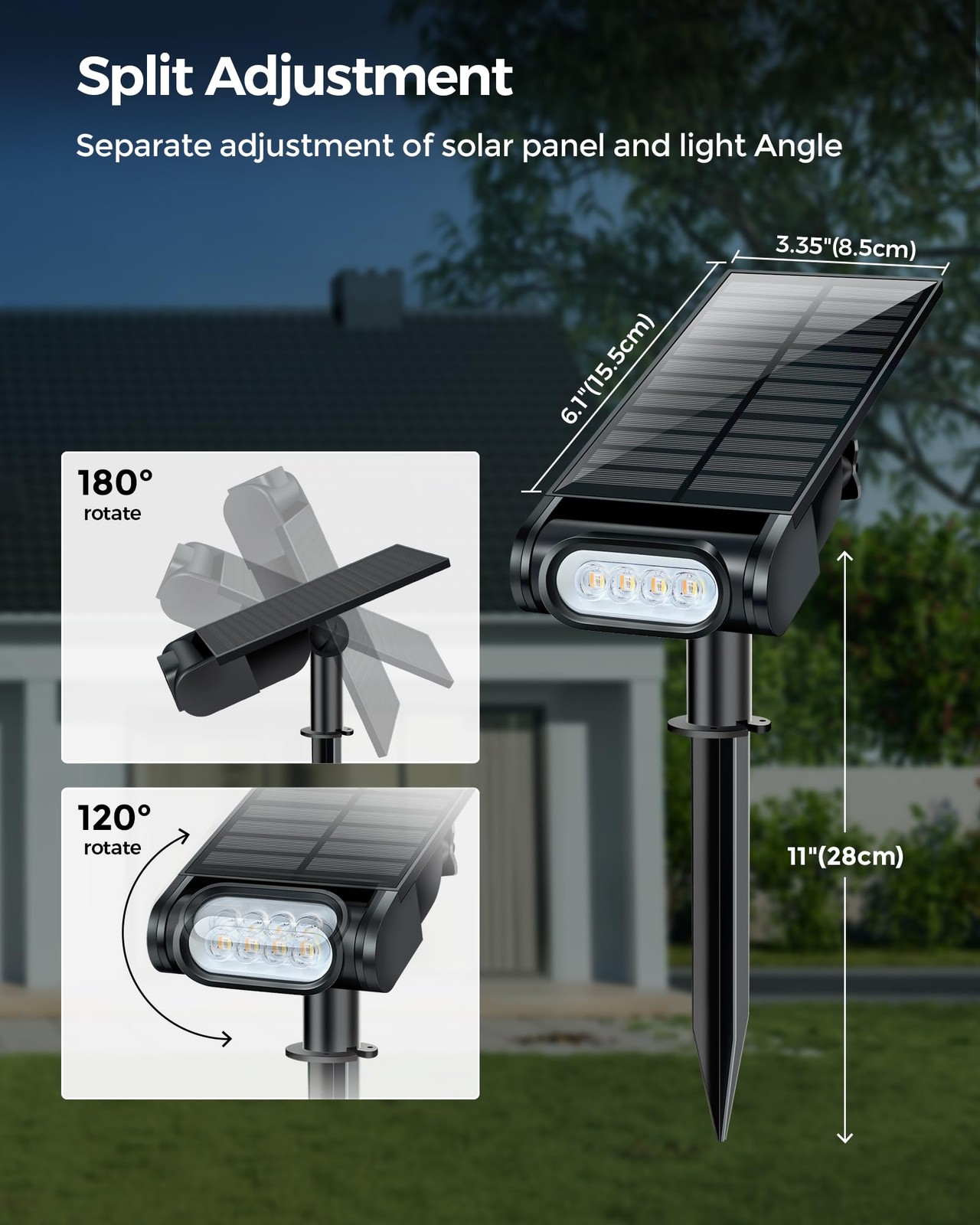 Introducing the Spotlight, a versatile and durable outdoor lighting system crafted from ABS + PC materials, featuring an IP67 waterproof rating for all-weather resilience. This solar-powered luminaire boasts a 2W monocrystalline silicon solar panel encased in glass, capable of a 120° adjustable tilt to capture optimal sunlight. The Spotlight offers a high lumens light output with a color temperature range of 2700K to 6500K, and an additional 10lm for RGB lighting. Designed for a 2-year lifespan, it houses a 1800mAh battery with a 300 cycle life, providing 6~15 hours of illumination on a full charge. With a user-friendly 433MHz remote control operating at a 30ft range, the Spotlight can be easily installed either on the ground or wall-mounted. Complying with international standards, it comes with all necessary accessories for a seamless setup, making it an ideal choice for enhancing outdoor spaces with reliable, energy-efficient lighting. Remote Control & Tap Control: outdoor solar lights for yard come with a sensitive remote control that makes it easy to manage the power, two-levels brightness adjustment, timer and color temperature (warm and cold), 12 colors of RGB, as well as fade and flash modes. Combining warm and cool and 12 RGB colors in one light, it is suitable for any environment. A button on the light body switches the light on and off and between two color temperatures. High-Power beads & Color Changing: solar spotlights outdoor waterproof come with 4 high-power 0.5W light beads (measuring 5mm x 5mm with a convex lens made of high-quality material, others: common 2.8mm x 3.5mm LED beads), compatible with 12-color RGB and warm-cold tri-color options, allowing a single light fixture to display a variety of colors and forms. Larger Solar Panel & 1800mAh Battery: solar color changing lights outdoor is equipped with a larger solar panel 3.35“*6.1” (other products: 2.5“*4.3”) that can convert sunlight at an efficiency of 25%. The built-in 1800mAh battery can provide 6~15 hours of lighting after fully charged. IP67 Waterproof: solar uplights outdoor are made of ABS+PC materials combined with monocrystalline silicon solar panels with an IP67 waterproof rating. All products have been through a stringent waterproof quality inspection process, submerged in water at a depth of 1 meter for 30 minutes without water ingress. 2 IN 1 Design, Easy Installation: Use the included stake to insert the outdoor solar lights into the ground, or mount it to the wall using the wall support and screws. Easily install in seconds and enjoy comprehensive yard lighting from paths, gardens to driveways. Solar outdoor lights waterproof can be placed anywhere such as gardens, paths, decks, lawns, pathways, driveways, front yards, cottages, landscapes, balconies and outdoor places.