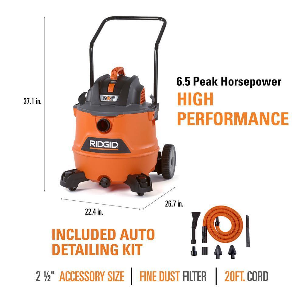 Welcome to Contact Us Add to Favorite Fast Shipping Hassle Free Return eBay Money Back Guarantee Authenticity Guarantee Features Built with RIDGID s most powerful motor & largest capacity drum Auto cleaning detail kit includes 7 premium vac tools Item Description The RIDGID 16 Gal. NXT 6.5 Peak Horsepower Wet/Dry Shop Vacuum was built with RIDGID's most powerful horsepower motor, engineered for the pros with the toughest cleanups and comes with the Premium Auto-Detailing Car Cleaning Kit. The Car Cleaning Kit is the ideal collection of accessories for interior car cleaning, featuring a 1-1/4 in. x 10-ft premium hose, soft bristle brush, stiff bristle brush, flexible crevice tool, claw nozzle, hose-to-hose adapter, and 1-1/4 in. to 2-1/2 in. adapter. This model includes a cart with large rear wheels, the fine dust filter (VF5000) to capture fine powders and debris and accessories to equip the pro for any job - 2 extension wands, a utility nozzle, car nozzle, wet nozzle, crevice tool and a muffler/diffuser. The drum offers maximum capacity at 16 gal. and the 2-piece drum construction provides lasting durability. Storage is readily available with hooks to store the hose and caster feet that fit both 1-7/8 in. and 2-1/2 in. accessories. The 2-1/2 in. locking shop vac accessories lock onto a wand or hose for uninterrupted cleaning. Large power switch, bottom drum handles and built-in drain upgrades the vac. The Qwik Lock Filter makes installing or removing your filter quick, easy, and secure. Pro Tip: Add a replacement RIDGID shop vac filter (sold separately) to a RIDGID shop vac to maintain the power of the vac and extend vacuum life and a collection bag (VF3502, VF3602, VF3702; sold separately) to help with quick cleanup and disposal. Air Volume (CFM): 184 Amperage (amps): 12 Blower Port: Included Color Family: Oranges/Peaches Cord Length (ft.): 20 ft Cordless/Corded: Corded Debris Type: Cold Ashes,Dust Mites,Fine Powders,General Debris,Mold,Pollens,Sawdust Filter Type: Cartridge Included Accessories: No additional accessories included Power Source: Electric Product Weight (lb.): 26.9 lb Recommended Surfaces: Auto Interior,Bare Floor,Carpet,Concrete,Hardwood Floors,Leather,Stairs,Tile,Upholstery,Vinyl,Wood Returnable: 30-Day Tools Product Type: Vacuum Vacuum Maximum Capacity (Gallons): 16 gal Voltage (V): 120 V Wet/Dry Attachment & Accessory Type: Car Cleaning Kit Hose Diameter (in): 2.5 in Hose Length (ft.): 7 ft Peak Horsepower (php): 6.5 Product Depth (in.): 26.7 in Product Height (in.): 37.1 in Product Width (in.): 22.4 in About us Customer service is our top priority! Please be sure to read the description thoroughly to make sure that this is the item you want before making a purchasing decision. If you have any questions about this item, please contact us via eBay messages before placing your order. We make every effort possible to accurately describe and depict the items. Please be aware that slight variations in color may be due to differences in lighting and computer monitor resolutions. All items are in stock at the time of listing; however, in the unlikely and unforeseen event that we are unable to fulfill your order through any of our networked warehouses, we will notify you as quickly as possible and offer you a 100% refund on your purchase. Thank you for shopping with us. We appreciate your business! Payment PayPal is our preferred method of payment. If you do not have a PayPal account, all major credit cards are gladly accepted through PayPal as the payment processor. PayPal offers great buyer and seller protection. Your order will be processed pending receipt of cleared payment through PayPal. Sales tax may be charged depending on your location. Shipping We provide fast, free shipping. Most items are shipped within 3-5 business days of receiving cleared payment. We ship to the lower 48 contiguous United States only. We do not ship to P.O. Boxes or APOs. For select items, we ship internationally through eBays Global Shipping Program. We do ship most of our smaller items internationally using eBays Global Shipping Program. If ordering electrical items outside of the U.S., please note that they will come equipped with a standard U.S. voltage plugs. You will need a suitable adapter to use the item in your country. Certain restrictions apply. Standard or Economy Shipping is ALWAYS FREE! You will be notified via eBay messages as soon as your items ship. Special Notice for Freight Items: If an item ships via Freight (Truck) Delivery, a valid phone number will be required so that we can contact you to schedule delivery. The item may be delivered with curbside delivery. An adult signature will be required. Please be sure to have available help on hand to assist you with moving the item to the desired location in or outside of your home. Freight items must be inspected upon delivery. In the unlikely event that damaged is observed, you MUST refuse delivery and note the damage on the shipping receipt and send it back via the Freight carrier. Returns will not be accepted on Freight items after they have been delivered, inspected, and the driver has left the premises. Returns We offer a 30 day return/exchange policy for most of our products. You can request a refund if you are dissatisfied for any reason with your product. (Restocking Fee May Apply). Only factory defects are accepted as a reason for a return. In the case of factory defects, if available, we will replace the product for you. When returning an item, it must be in all of the original packaging and include all of the original accessories or items that came with it. The item and package should be in original and perfect condition. You will be required to cover shipping on the return of non-defective items. All returns MUST be done within 30 days of date of purchase. Please note that we cannot give refunds or replacements after the 30 day limit has expired. When sending in a return, please note that it can take up to 7 business