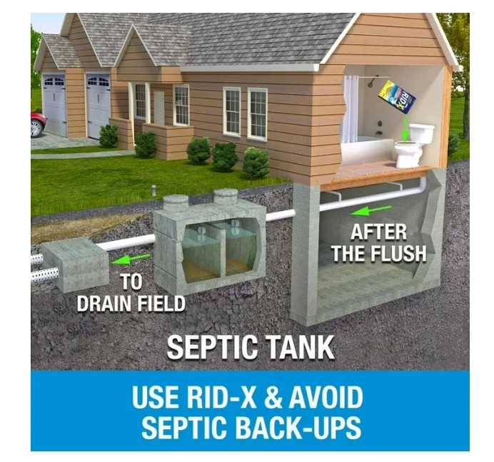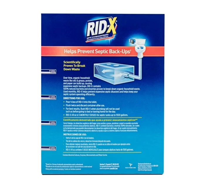 RID-X Septic Treatment, 5 Month Supply Of Powder, (49 oz.) Free Shipping RIDx Description : Protect Your Septic System with RID-X Ensure the longevity and efficiency of your septic system with the RID-X septic system treatment powder. This 49 oz. pack is designed to prevent clogs before they become a problem, safeguarding your pipes and septic systems. Trusted by professionals, it is a natural and safe solution that is compatible with most septic systems. Why Choose RID-X Septic System Treatment? The RID-X septic tank treatment is your best defense against septic backups. It features a concentrated powder formula packed with billions of natural bacteria and advanced enzymes. These components work immediately to break down solid organic waste, helping to maintain a healthy balance of septic bacteria. RID-X ensures a free-flowing septic system, saving you from the stress and expense of dealing with backups. Key Specifications: Box contains 49 oz. Safe for all pipes and septic tanks Convenient and easy to use - just add to toilet and flush Effectively breaks down waste to prevent septic back up Assists in maintaining a free-flowing septic system Product Highlights: Size / Count : Box contains 49 oz. Form : Powder Certifications and Claims : Effectively breaks down organic household waste like proteins, paper, oils, grease, and detergent Septic Safe : Yes Allergens / Warnings : KEEP OUT OF REACH OF CHILDREN. CAUTION: Contains bacterial spores and enzymes. May cause eye irritation. Avoid contact with eyes. Avoid breathing dusts. Individuals having known allergies, particularly to enzymes, as well as those with respiratory disease or disorders, should avoid contact with this product. Wash hands thoroughly after use. First Aid: If in eyes, immediately rinse eyes with water. Remove any contact lenses and continue rinsing eyes for at least fifteen minutes. If irritation develops, get medical attention. If inhaled, move to fresh air. If irritation develops, get medical attention. Use Instructions : Add to toilet and flush Customer Satisfaction Guaranteed Your satisfaction is our top priority! We're committed to providing a smooth and positive shopping experience. If you have any questions or concerns, please don't hesitate to reach out? we're here to help. Your issue will be resolved quickly and fairly. Thank you for shopping with us! FREE SHIPPING! We invite you to place your order now to take advantage of our fast and free delivery service. Satisfaction guaranteed.