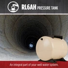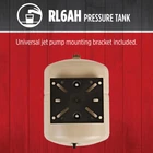 A pressure tank is an essential part of a pressurized water system that provides water pressure. The tank stores water between the diaphragm and the liner. The pressure tank reduces the number of times the pump needs to start significantly increasing the lifespan of your well pump. The tension of the diaphragm maintains the water pressure within the system ensuring proper operation of all water appliances such as a dishwasher and washing machine and provides a robust flow of water for showering. No maintenance is needed. A properly set-up pump and tank will work as a team to deliver water pressure to your home and provide many years of dependable service. The RL6AH tank is a 6-gallon horizontal tank with a drawdown of 1.9 gallons at 30/50 PSI. It is designed to handle 1 water fixture at a time. The RL6AH is equipped with a 3/4-inch MNPT threaded straight system connection. The RL6AH is made of heavy-duty 20-gauge cold rolled carbon steel with a 304 stainless steel connector. It has a triple grade almond paint finish. The liner material is FDA grade polypropylene. The unit is rated at a maximum working temperature of 194 degrees F and a maximum working pressure of 150 PSI. Initial set-up: The tank is pre-charged to 20 PSI in order to transport this pump safely and must be filled with air to 2 PSI below the cut-in setting of the pressure switch. For example, a 30/50 system needs 28 PSI of air in the tank. A 40/60 system needs 38 PSI. To fill the pump with air, use a standard bicycle pump and monitor the pressure using a pressure gauge (not included). This unit is equipped with a space saving thermoplastic universal pump mounting plate that allows a jet pump to be attached directly to the tank. This system is NSF/ANSI/CAN 61/CAN 372 tested and certified by WQA. APPLICATION: Designed to work with a well pump system to maintain water pressure when the pump is not running; certified for safe, clean, drinking water NSF/ANSI/CAN 61 and NSF/ANSI/CAN 372 approved BUILT TO LAST: Heavy-duty 20-gauge steel tank; 304 stainless steel water connection with patented leak safe technology; high performance variable geometry butyl rubber diaphragm; propylene liner SET-UP: Tank is pre-charged to 20 PSI for transportation; air pressure in the tank must be topped off with a bicycle pump to 2 PSI below the pressure switch cut-in setting PUMP MOUNTING BRACKET AND STAND INCLUDED: mounting bracket allows pump to be installed onto tank; stand lifts tank off of the floor preventing condensation from forming and staining of the floor SPECIFICATIONS: 6 gallon horizontal tank; 1.9 gallon drawdown @ 30/50 PSI; handles 2 water fixtures running simultaneously; 3/4" MNPT straight system connection, NSF/ANSI tested/certified by WQA