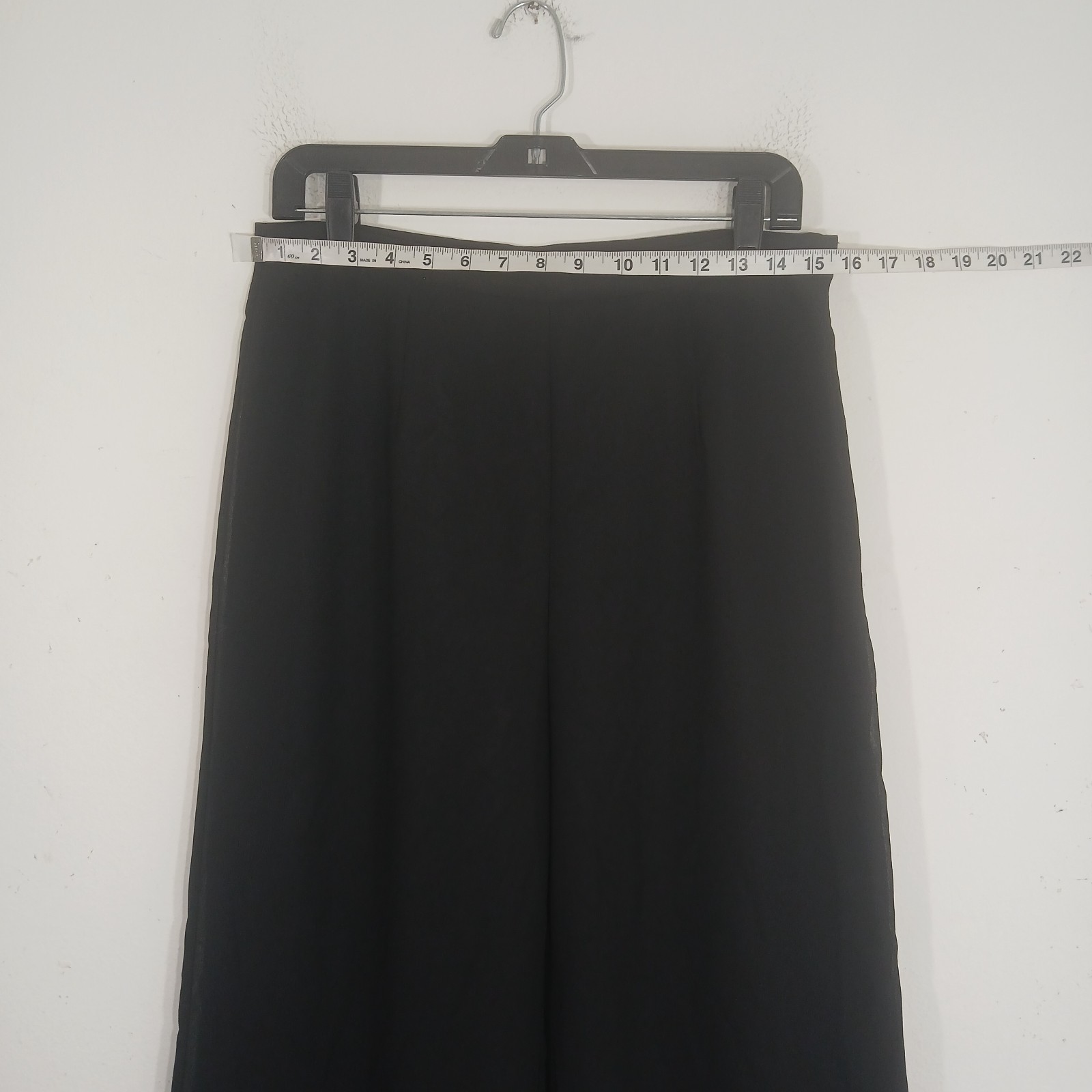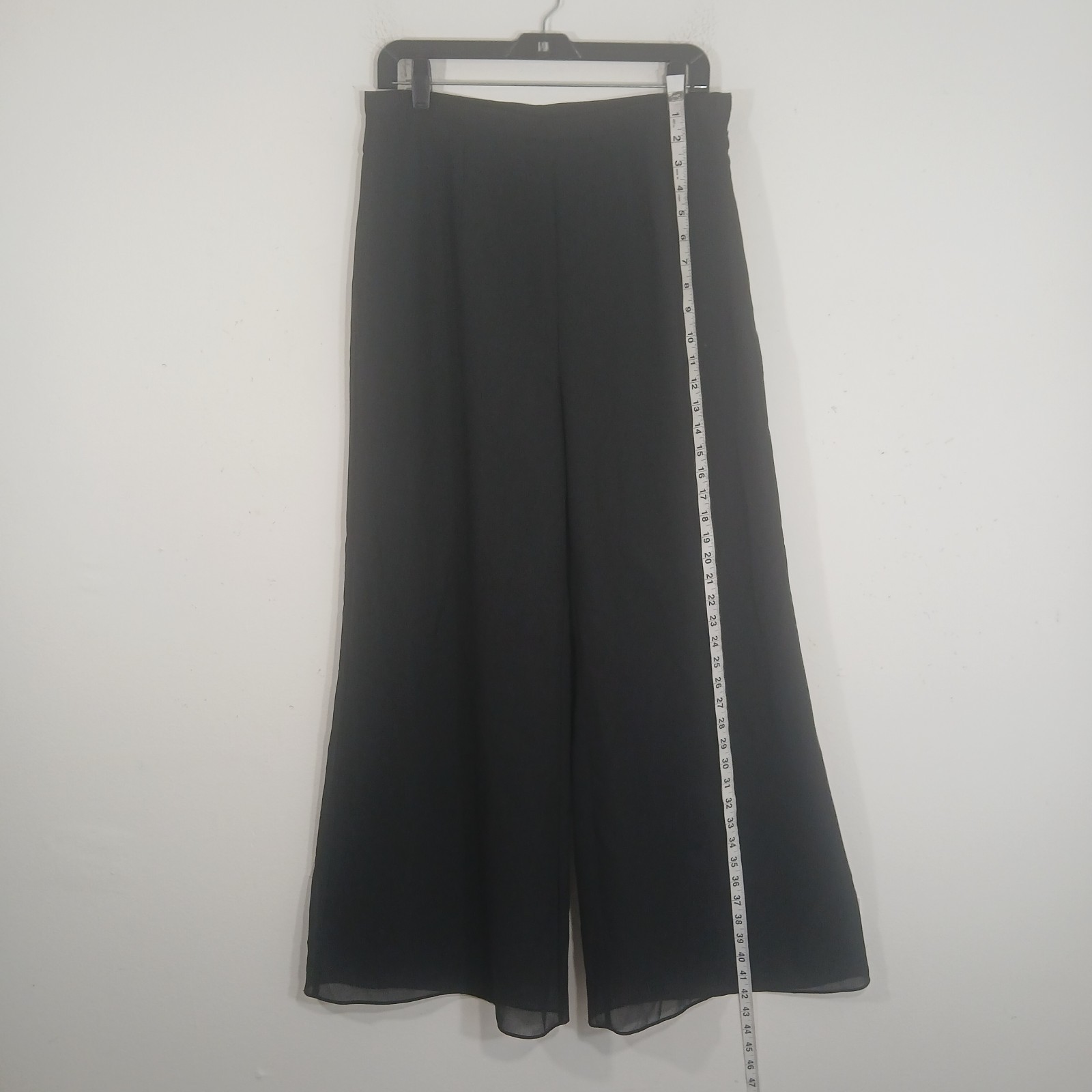 These R&M Richards Black Palazzo Pants in Women's Size 10 are elegant and dressy, perfect for special occasions like weddings, parties, or business events. Made of chiffon fabric with a sheer overlay, they feature a high rise and wide-leg style for a formal and sophisticated look. The pants are lined and accented with a side zipper closure, making them a versatile and stylish addition to any season's wardrobe. Made of 100% polyester, they come in a classic black color and are designed for a regular fit for women who appreciate formal and elegant attire.