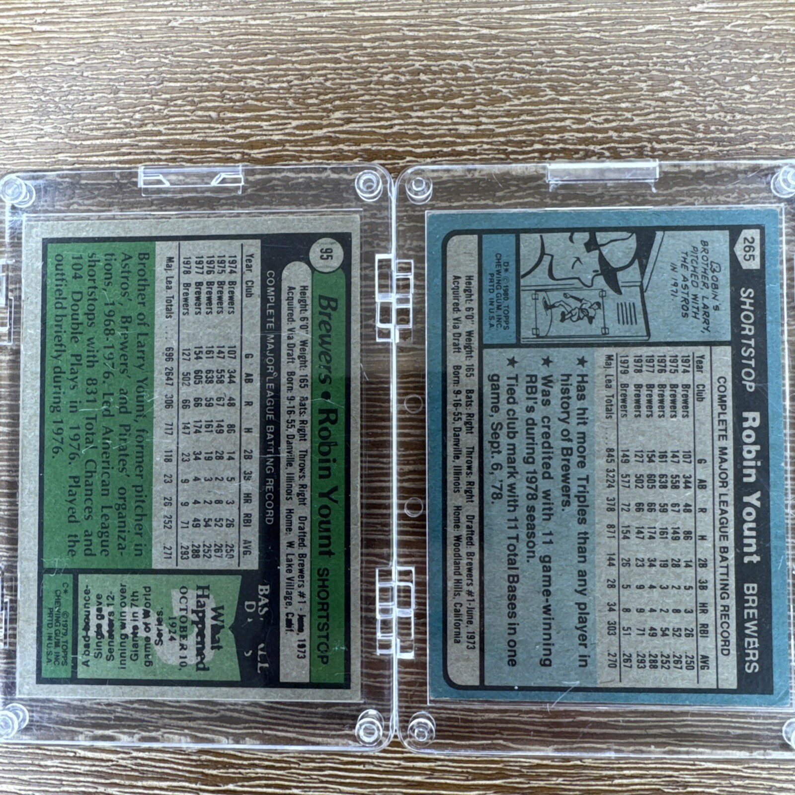 This vintage Topps trading card lot features two cards of baseball legend Robin Yount, player/manager of the Milwaukee Brewers. The cards are from the 1979 and 1980 sets, and are both in excellent shape. The lot is perfect for any Major League Baseball fan or sports trading card collector, and is sure to be a valuable addition to any collection. The cards are manufactured by Topps, and are part of the base set. Don't miss out on this rare opportunity to own a piece of baseball history!