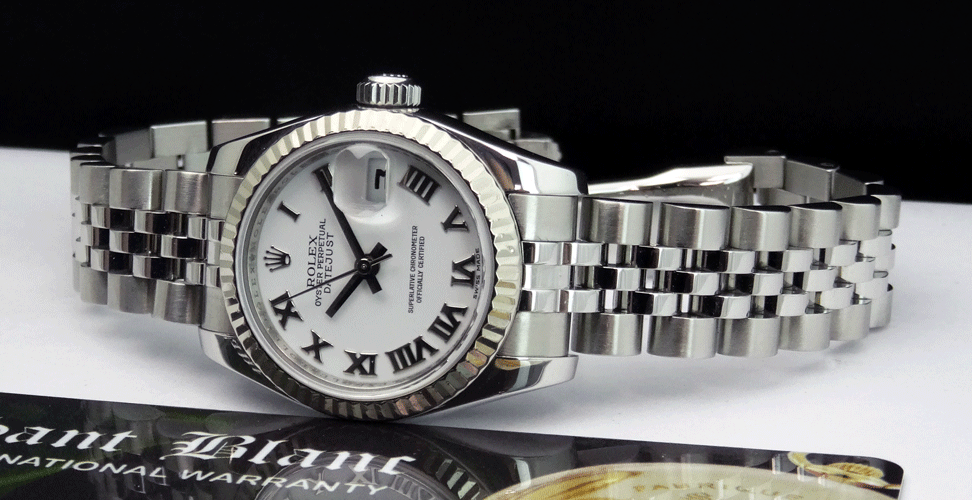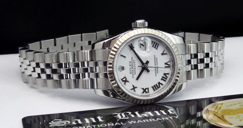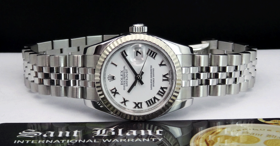 ROLEX - Ladies 18kt WG & SS Datejust - White Roman Dial - Model 179174 Authentic Rolex ROLEX - Factory White Roman Dial ROLEX - Ladies 18kt White Gold & SS Datejust ROLEX - Ladies 26mm Datejust Timepiece Details Absolutely Stunning brilliant Rolex White Roman Dial! This is the 26mm size 18kt White Gold & Stainless Steel Rolex Datejust model 179174: This is the style with the Rolex Stainless Steel Jubilee bracelet. To replace this Rolex has an estimated MSRP of $7,250. This Rolex is in pristine condition...Priced to sell immediately! Comes with genuine Rolex presentation boxes, Rolex books, Rolex tag, Retail Appraisal and The Sant Blanc Three Year Warranty!...In pristine condition...The Perfect Gift! This Rolex is authentic and stunning. Unconditionally guaranteed to be authentic Rolex. Returns & exchanges accepted. Returns for refund are accepted.. I have set the reserve well below the current value placed on this timepiece. SANT BLANC is a Swiss watch and timepiece specialist and not a Rolex dealer and have no affiliation with Rolex Watch USA. This Rolex timepiece is unconditionally guaranteed to be authentic. We are the sole warrantors of this timepiece. For questions please contact SANT BLANC through eBay ... Authentic Rolex. It does not get any better than this! Pictures do not reveal the radiant beauty of this timepiece. This Rolex is authentic and stunning. Unconditionally guaranteed to be authentic Rolex. Returns & exchanges accepted. Returns for refund are accepted.. I have set the reserve well below the current value placed on this timepiece. I am a Swiss Timepiece Specialist and not a Rolex dealer and have no affiliation with Rolex Watch USA. This Rolex timepiece is unconditionally guaranteed to be authentic. No factory warranty attached. We are the sole warrantors of this timepiece. For questions please contact SANT BLANC through eBay ... Payment must be received within 5 days of the end of the auction Payment Information The winning bidder must contact us within 2 days and payment must be received within 5 days of the close of this auction. If you you are unable to complete payment within 5 days, you must contact us immediately by phone SANT BLANC or contact Contact Our eBay Store: SANT BLANC . Guarantee This article meets or exceeds the demanding standards and specifications set by Sant Blanc. This item is authentic and genuine in pristine condition, functions properly and accurately and comes with a full seven day return money back guaranty. We are not responsible for photography and description errors and omissions in this auction. Changes and modifications to this description may be made at any time, and for any reason with out notice. This auction may be ended at anytime without notice. Warranty SANT BLANC warranty is for a full three years. The dependable operation of this article for a period of three years from the date of purchase. Modification, tampering and abuse void warranty. SANT BLANC is the sole warrantor of this article, the factory warranty no longer apply. SANT BLANC Service & Warranty Division and The SANT BLANC Service Center, services and repairs Swiss Made watches and timepieces. The SANT BLANC Service and Warranty Division has over 30 years experience as Swiss Timepiece specialist factory trained and certified "Watchmaker". The credentials include AWCI CW21 certified as one of the world's leading watchmaker. Our watchmaker is a certified graduate watchmaker with continuing Swiss Watch education including training from the Rolex Dallas Training Facility. Sant Blanc is dedicated to setting the highest standards in Swiss Timepiece excellence. We have a complete Swiss watch service center. We do our own in-house photography, and research. Please contact us if we can be of service to you. Shipping Information FedEx/UPS shipping is included.. This item is professionally packaged and shipped fully insured, adult signature required at delivery. We ship via FedEx, UPS, Brinks, Private Courier and United States Express Mail. Items are typically shipped within two business days of receipt of payment. You will be notified when your item has been shipped. We are not responsible for shipping and/or delivery delays resulting from acts of nature, theft, strikes, or shipping company errors affecting the shipment and/or delivery. This shipment is fully insured.. We ship world-wide fully insured by: UPS, FEDEX, BRINKS, Private Courier, and United States Express Mail. ATTENTION International Customers. NOTICE: International shipments are shipped at the customers risk to shipping delays, international and national regulations, Customs fees, taxation, and damage due to and/or resulting from shipping. We are not responsible for shipping delays, damage, theft, acts of nature affecting the shipment, Customs duties, fees, taxation or regulatory import restrictions . This disclaimer applies only to shipments outside the United States, and does not apply to shipments within the United States. Arrangements must be made for delivery to PO boxes. Provide a physical address, and contact phone number with your payment. If payment is made by PayPal, and your shipping address is different than your confirmed address in PayPal, you must contact us directly to let us know of the requested change. Address change approval will be sent to you, otherwise this item will be sent to your confirmed PayPal address. About Sant Blanc SANT BLANC is a Swiss Timepiece Specialist Company, located in Branson Missouri USA. The Sant Blanc Service Center is a state of the art service facility, servicing all Swiss Made watches and is open to our customers by appointment. The Sant Blanc Sale Division specializes in offering the finest Swiss Made Timepieces. The Sant Blanc Consignment Division sells watches on behalf of our customers. Thank you for your interest SANT BLANC Notice: SANT BLANC is not an official nor an authorized dealer for any product offered or sold and SANT BLANC has no affiliation with the m