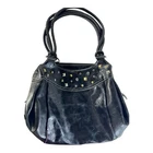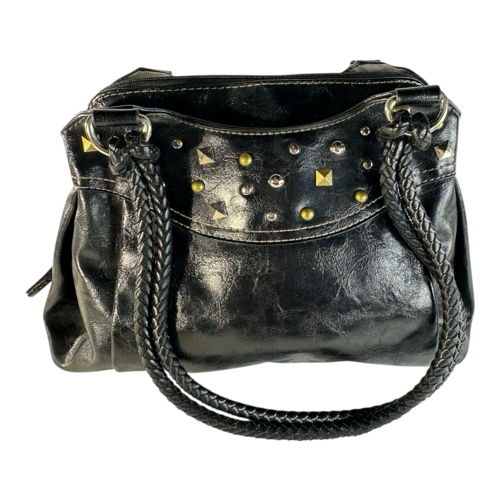 The Rosetti NY VTG 90s Y2K Shoulder Bag Purse is a stylish and classic medium-sized bag made of vegan leather with a matte finish. This rectangular-shaped bag features a unique studded design with a pink lining, adding a trendy touch to any outfit. The bag is equipped with a zip, magnetic, and snap closure, as well as silver hardware accents. Ideal for casual occasions, this shoulder bag includes inner and outer pockets for added functionality. With its vintage appeal and attention to detail, this Rosetti bag is a must-have for any fashion-forward woman.