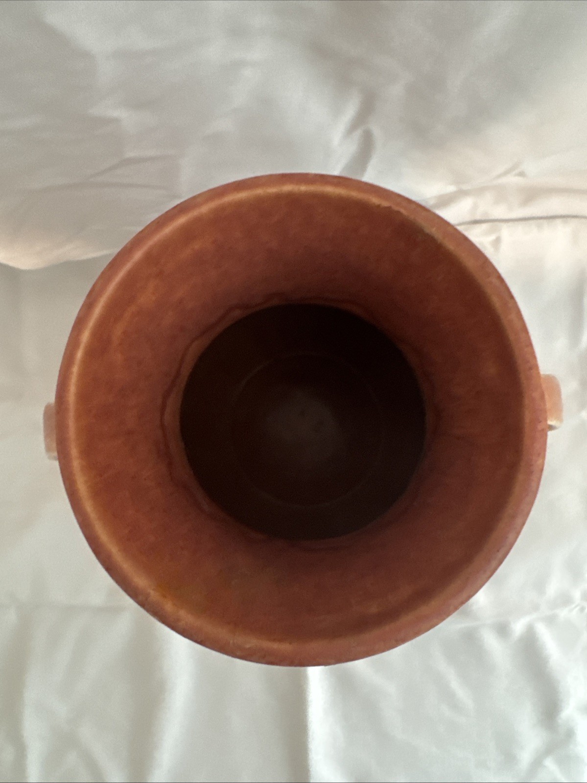 The ROSEVILLE-Windsor #528-9 Molted Rust Fern Vase from 1932 is a rare and beautiful piece of vintage American pottery. This 9" tall vase was produced in the United States using an arts and crafts/mission style design. This color and style are increasingly hard to find. The low luster finish adds to the unique charm of this original Roseville piece, making it a stunning addition to any decorative pottery or glassware collection. Estate fresh, no damage or alterations. This vase embodies the elegant style and craftsmanship of early 20th-century art pottery.