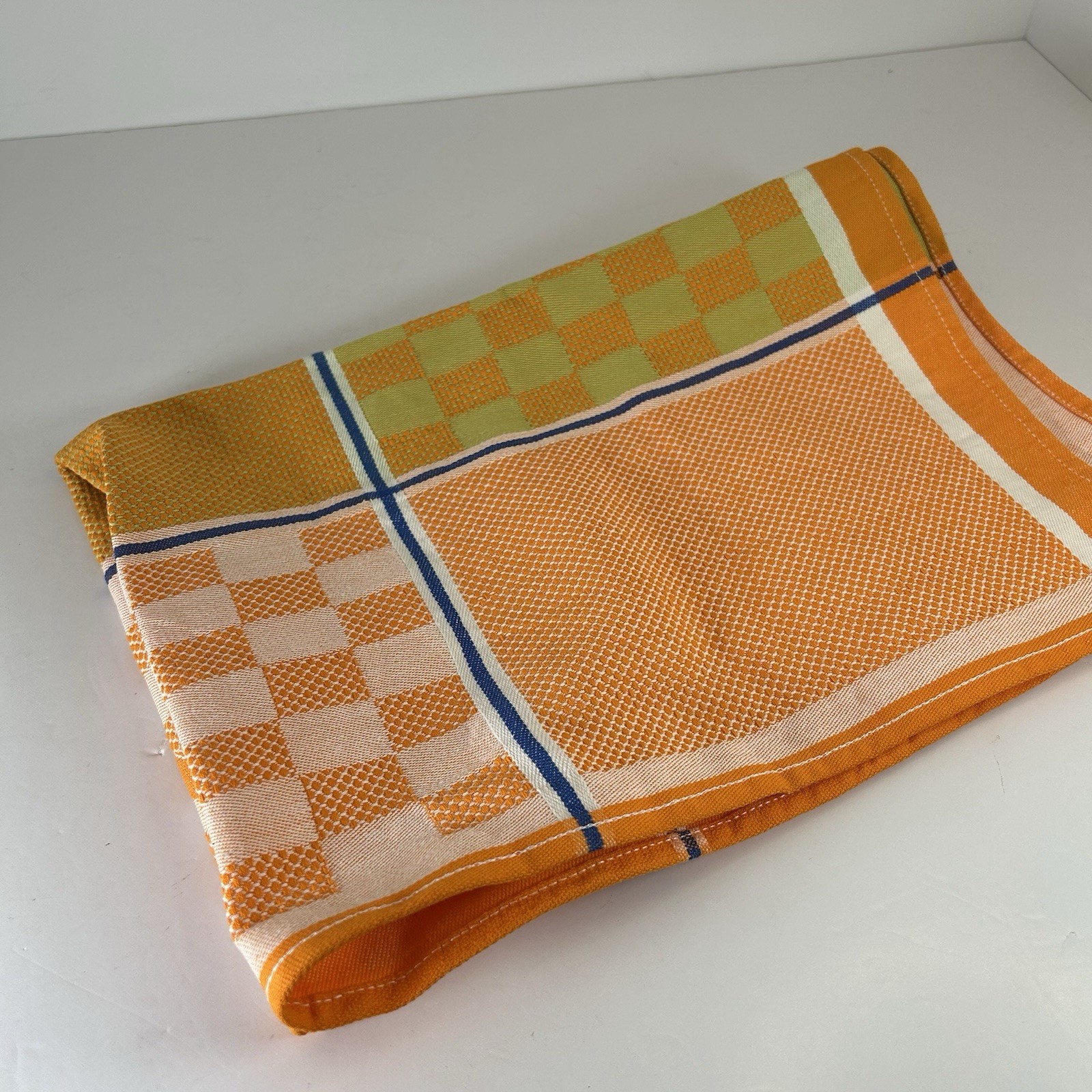 ROSS Germany 100% Cotton Tea Towel Orange Blue Stripe Writing Good overall condition. Fast shipper.
