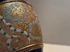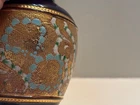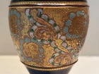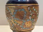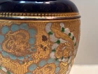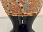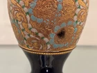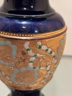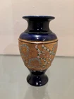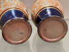 For your consideration…. a charming pair of Royal Doulton Slater’s Patent vases, each standing 5 ⅝ inches tall. These petite stoneware vases feature a rich cobalt blue ground decorated with raised blue and white enamel scrollwork and gilt floral detailing over a soft beige central band. Gold gilding also accents the rims and bases. Measurements: 5-5/8 in. (15.15(cm) high and 3 in. (7.62cm) wide. Marks: - Both vases are impressed “Royal Doulton England”, dating them after 1902 (when the Lambeth mark was no longer used). - Additional incised marks include “7078” (the shape/design number for this Slater’s line), “672” with a square above it, and on one vase a small “1” or “f". - Each also bears a hand-inscribed decorator’s monogram (resembles a “G” or “U” with a slash)