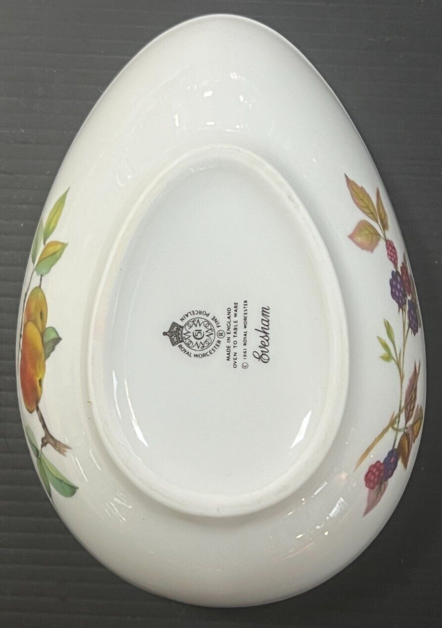 ROYAL WORCESTER EVESHAM AVOCADO DISH A FINE ROYAL WORCESTER AVOCADO DISH IN THE "EVESHAM" PATTERN. ESTATE FRESH, NICE USED CONDITION. MEASURES 5.75" AT THE WIDEST POINT. MARKED AS SHOWN. PLEASE SEE ALL IMAGES AS THEY ARE AN INTEGRAL PART OF THE DESCRIPTION AND ASK ALL QUESTIONS PRIOR TO BIDDING. ALL ITEMS ARE PRE-OWNED AND AS SUCH MAY SHOW SOME SIGNS OF PREVIOUS USE SUCH AS MINOR MARKS AND BLEMISHES. PLEASE CONTACT US IF YOU WISH A MORE DETAILED DESCRIPTION OF A PARTICULAR ITEM.