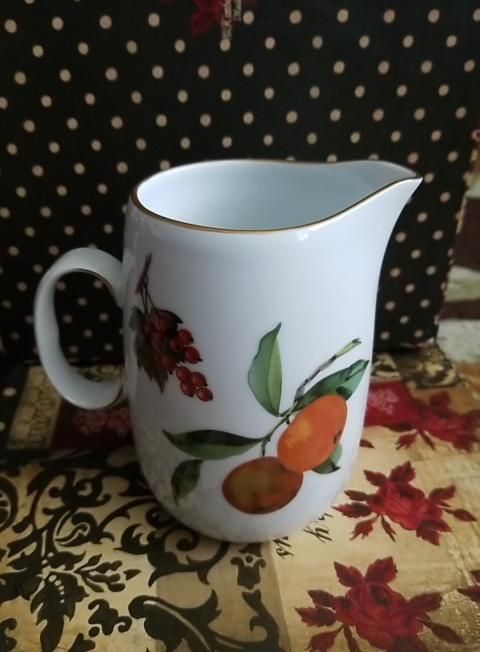Color:White WITH FRUIT ON THE TREE WITH GOLD TRIMType:20 ounce jug pitcherItem Height:5.75"Brand:Royal WorcesterFeatures:FREEZER TO OVEN-OVEN TO TABLEPattern:EVASHAM GOLD 1961 ENGLANDCountry/Region of Manufacture:United KingdomYear Manufactured:1961Collection:FINE CHINA ENGLANDSet Includes:Jug Creamer 20 ouncesStyle:Arts & Crafts/Mission StyleOrigin:EnglandOriginal/Reproduction:Contemporary OriginalTime Period Manufactured:1960-1969Material:FINE PORCELAIN CHINAItem Width:3" across the top