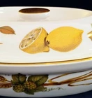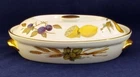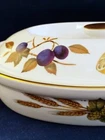 Oval entrée dish and lid in the beautiful Evesham Gold pattern by Royal Worcester, a classic design of various transfer fruits and vegetables on a glossy crisp white background trimmed in 22 karat gold. Manufacturer: Royal Worcester Pattern: Evesham Gold Item: Entrée Dish and Lid Shape: Oval Length: 10 1/2" Width: 7" Height: 2 3/8" Oven To Table Hand Wash Recommended Made in England The dish presents in good pre-owned condition and appears unused with no chips, cracks, scratches or utensil marks observed. Some light wear to gold knob and a faint dark mark on inner recessed lip.