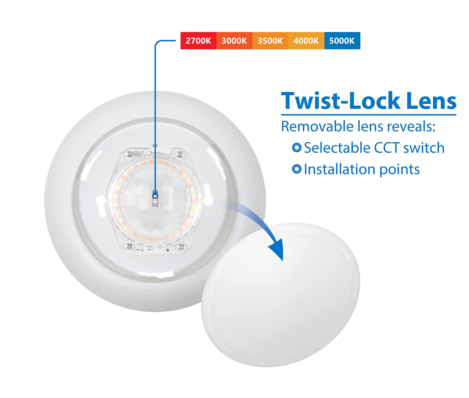 ’s RSDS56 series 6-inch Selectable CCT Surface Mount Disk Light provides a thin installation solution designed to fit the tightest of spaces. The removable twist lock diffuser makes installation easier than ever. The RSDS56 mounts directly to any 4” pancake, 4" non-metallic, or 4/O junction box with a flush to the ceiling fit for a clean, professional look. This fixture produces a high-quality light with a CRI rating of 93 and an R9 value of 60. The RSDS56 has a selectable CCT, giving you the ability to change between 5 different color temperature options (2700K, 3000K, 3500K, 4000K and 5000K) with a simple slide of a switch. Available in Black, Nickel, Oil-Rubbed Bronze and White finishes. Includes RDS56 LED downlight in White 5 Option Selectable Color Temperature: 2700K, 3000K, 3500K, 4000K, and 5000K Installs into any 4” pancake, 4" non-metallic, or 4/O junction box Dimmable down to 5% using standard TRIAC or ELV dimmers Produces over 921 Lumens at 15-Watts