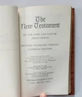 A 1965 hardcover edition of The New Testament of Our Lord and Savior Jesus Christ, Revised Standard Version Catholic Edition, in slipcase. Bible is in very good condition. Slipcase is sturdy with handling/shelving marks and some edge and corner wear. Bible has a ribbon bookmark and a clear plastic dust jacket; includes Appendix 1 and 2. Gold gilt book edges are like new. Covers and spine are solid and tight. Written inscriptions on front endpapers (see photos). Pages are otherwise clean and free of writing. See photos for condition details. Ships via USPS Media Mail.