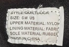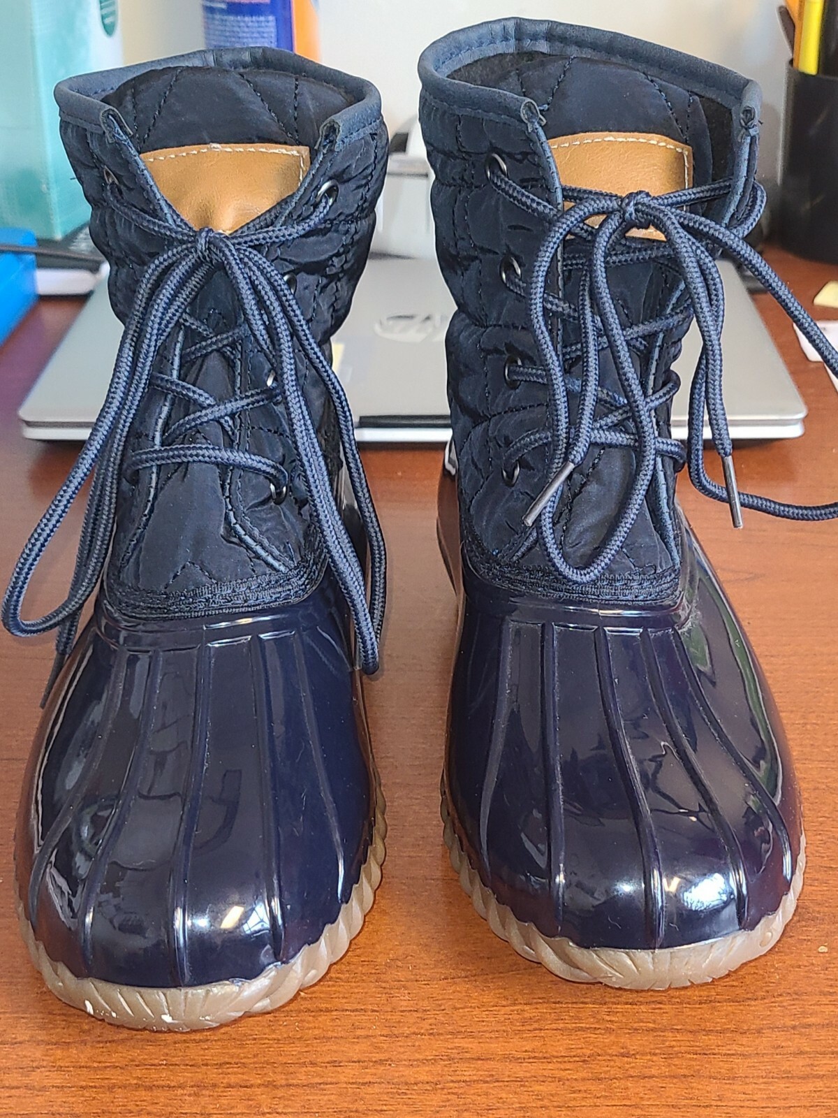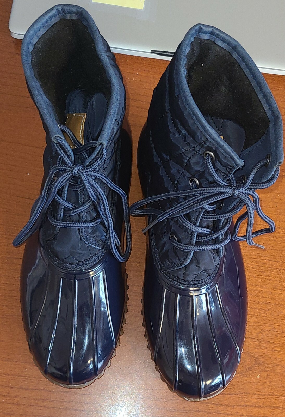 Rue 21 Women's Rain Duck Boot is a blue, quilted, lace-up boot made of nylon upper material and rubber outsole material. It is a rain boot with a duck theme and is designed for women with a US shoe size of 6.