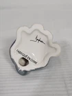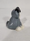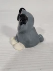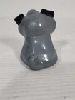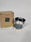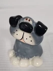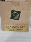 This is a small gray stoneware ceramic dog figurine from the "It's A Dawg's Life" collection by Russ Berrie. The figurine, designed by artist Doug Harris, is signed and features a glazed finish. It measures 1.875 inches in length, 2.25 inches in height, and 2 inches in width. It comes in a box packaging and was manufactured in China during the 1990-1999 time period.
