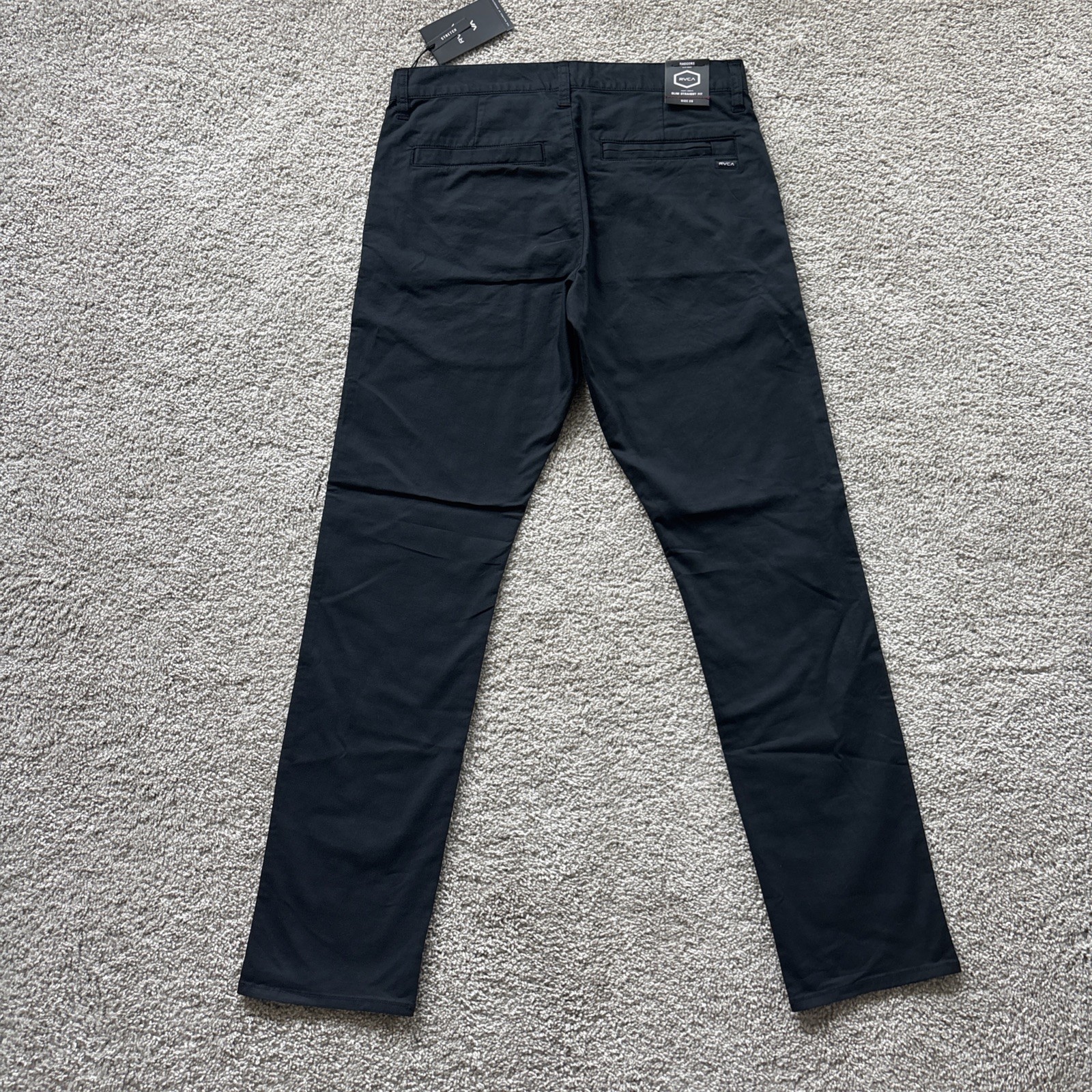 The RVCA Daggers Tech Black Chino Pants in Men's Size 29 are stylish and versatile pants suitable for various occasions such as travel, weddings, parties, casual outings, formal events, and business meetings. Made from a blend of polyester, spandex, and cotton, these pants offer comfort and stretch for added flexibility. With a mid-rise and slim fit, they feature a flat front, straight leg design, and slash pockets for a sleek look. Perfect for all seasons, these chino pants are machine washable and crafted by the renowned brand RVCA, known for their modern and preppy style.